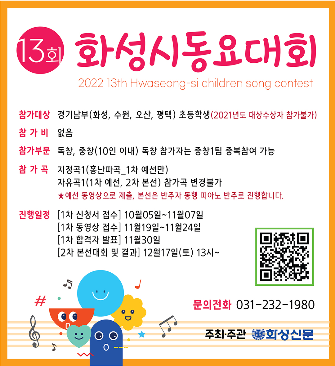 【[공 연]대관공연】13회 화성시동요대회 본선 장소 유앤아이센터 화성아트홀 기간 2022년 12월 17일 ~ 2022년 12월 17일 요일 토 공연시간 2022년 12월 17일(토) 13:00 티켓정보 추후 게시 관람등급 전체관람가 문의 031-232-1980 더욱 자세한 내용은 화성신문에서 확인하여 주시기 바랍니다.http://www.ihsnews.com/ 외벽 미디어보드 630x360.jpg [ Size : 124.24KB, Down : 65 ] 미리보기 다운로드 외벽 미디어보드 630x360 엘리베이터 DID 1080x1180.jpg [ Size : 538.44KB, Down : 724 ] 미리보기 다운로드 엘리베이터 DID 1080x1180 목록보기