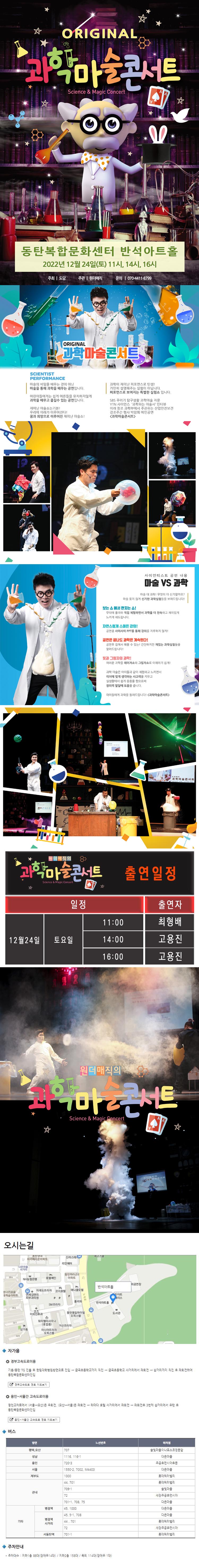 【[공 연]대관공연】과학마술 콘서트 장소 동탄복합문화센터 반석아트홀 기간 2022년 12월 24일 ~ 2022년 12월 24일 요일 토 공연시간 2022년 12월 24일(토) 11시, 14시, 16시 (소요시간 60분) 티켓정보 34000원 관람등급 24개월 이상(1인 1티켓 필수) 문의 070-4411-8799 예매처: https://tickets.interpark.com/goods/22015515 목록이미지_도담.jpg [ Size : 4.31MB, Down : 131 ] 미리보기 다운로드 목록이미지_도담 0129 과학마술콘서트 포스터 최종 사본.jpg [ Size : 1.84MB, Down : 71 ] 미리보기 다운로드 0129 과학마술콘서트 포스터 최종 사본 상세페이지_과마1 사본.jpg [ Size : 561.99KB, Down : 2,121 ] 미리보기 다운로드 상세페이지_과마1 사본 목록보기