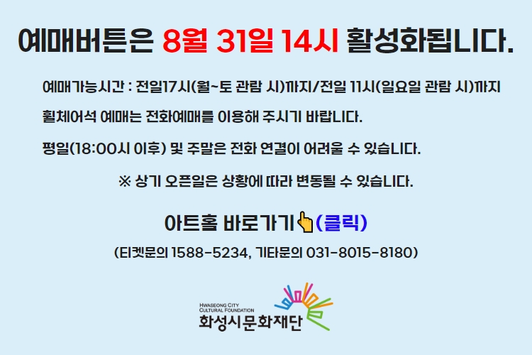 티켓 예매 안내 예매버튼은 8월 31일 14시에 활성화 됩니다. 예매가능시간: 전일 17시(월~토 관람 시)까지 /전일 11시(일요일 관람 시)까지 휠체어석 예매는 전화예매를 이용해주시기 바랍니다. 평일 18시 이후 및 주말은 전화 연결이 어려울 수 있습니다. 통합예약시스템을 통해 예매한 경우, 예매 확인 미취소는 유선상으로만 이용 가능합니다. 티켓문의 1588-5234 상기오픈일은 상황에 따라 변동될 수 있습니다.