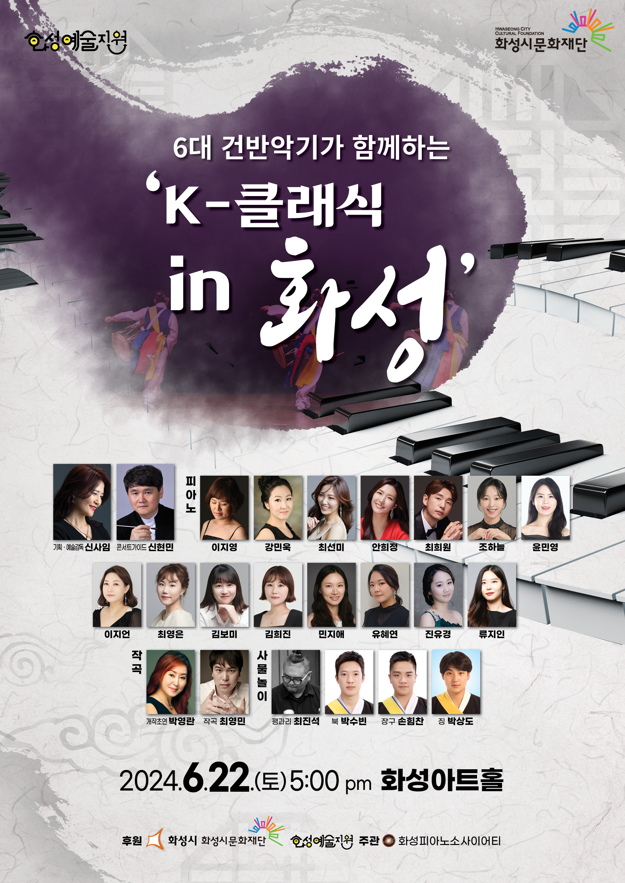1. 6대 건반악기가 함께하는 ‘K-클래식 in 화성’,장소:화성아트홀,기간:2024년 6월 22일~2024년 6월 22일