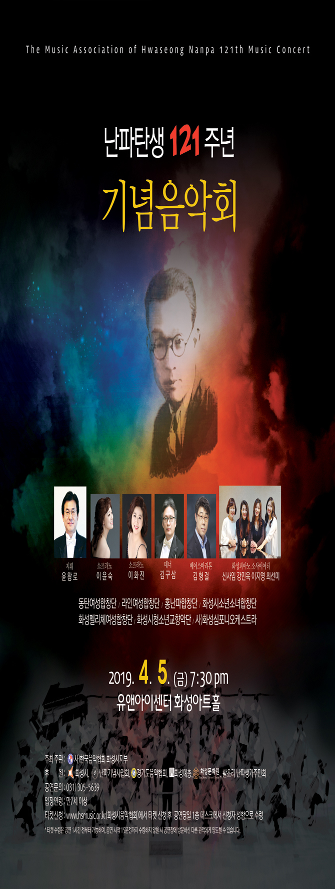 【[공 연]대관공연】난파탄생121주년 기념음악회 장소 화성아트홀 기간 2019년 4월 5일 ~ 2019년 4월 5일 공연시간 19:30 티켓정보 관람등급 만 7세 이상 문의 031)305-5639 - 상세이미지.jpg [ Size : 641.12KB, Down : 417 ] 미리보기 다운로드 기본이미지.jpg [ Size : 57.38KB, Down : 231 ] 미리보기 다운로드 목록보기
