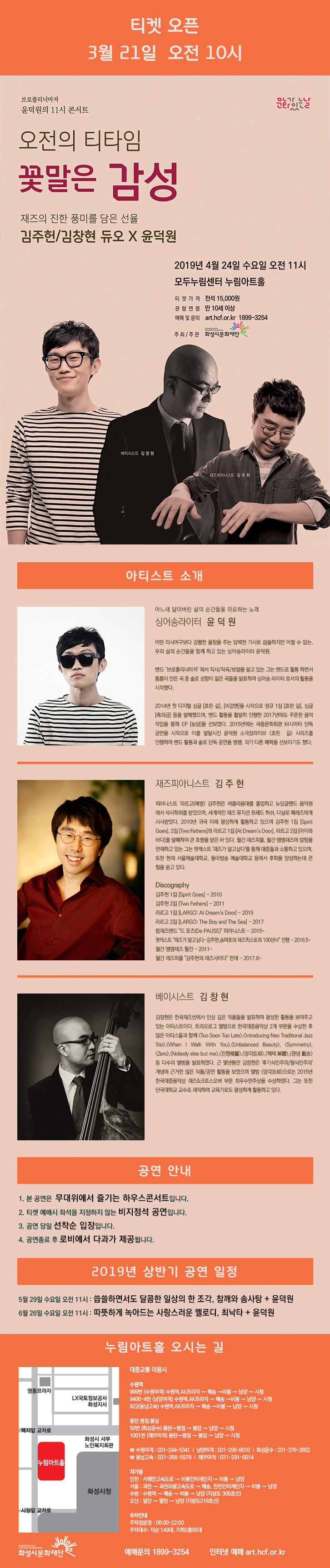 ![티켓 오픈 3월 21일 오전 10시, 브로콜리너마저, 윤덕원의 11시 콘서트, 문화가 있는 날, 오전의 티타임 꽃말은 감성, 재즈의 진한 풍미를 담은 선율, 김주헌/김창현 듀오X윤덕원, 2019년 4월 24일 수요일 오전 11시, 모두누림센터 누림아트홀, 티켓가격 : 전석 15,000원, 관람연령 : 만 10세 이상, 예매 및 문의 : art.hcf.or.kr , 1899-3254, 주최/주관 : 화성시문화재단, 베이시스트 김창현, 재즈 피아니스트 김주헌, 어느새 닳아버린 삶의 순간들을 위로하는 노래, 싱어송라이터 윤덕원, 어떤 미사여구보다 강렬한 울림을 주는 담백한 가사로 씁쓸하지만 어쩔 수 없는, 우리 삶의 순간들을 함께 하고 있는 싱어송라이터 윤덕원. , 밴드 ‘브로콜리너마저’에서 작사/작곡/보컬을 맡고 있는 그는 솔로 성향이 짙은 곡들을 발표하며 싱어송라이터로서의 활동을 시작했다., 2014년 첫 디지털 싱글 [흐린 길], [비겁맨]을 시작으로 정규 1집 [흐린 길], 싱글 [축의금] 등을 발매했으며, 밴드 활동을 활발히 진행한 2017년에도 꾸준한 음악 작업을 시작으로 이를 발달시킨 윤덕원 소극장라이브 <흐린 길> 시리즈를 진행하며 밴드 활동과 솔로 단독 공연을 병행, 각기 다른 매력을 선보이기도 했다., 재즈 피아니스트 김주헌, 피아니스트 '라르고(예명)' 김주헌은 버클리음대를 졸업하고 뉴잉글랜드 음악원에서 석사학위를 받았으며, 세계적인 재즈 뮤지션 프레드 허쉬, 다닐로 페레즈에게 사사받았다. 2010년 귀국 이래 왕성하게 활동하고 있으며 김주헌 1집 [Spirit Goes], 2집 [Two Fathers]와 라르고 1집 [At Dream's Door], 라르고 2집 [아이와 바다]를 발매하여 큰 호평을 받은 바 있다. 월간 재즈피플, 월간 엠엔재즈에 칼럼을 연재하고 있는 그는 팟캐스트 '재즈가 알고싶다'를 통해 대중들과 소통하고 있으며, 또한 현재 서울예술대학교, 동아방송 예술대학교 등에서 후학을 양성하는데 큰 힘을 쏟고 있다. , Discography, 김주헌 1집 [Spirit Goes] - 2010 , 김주헌 2집 [Two Fathers] - 2011, 라르고 1집 [LARGO: At Dream's Door] - 2015, 라르고 2집 [LARGO: The Boy and The Sea] - 2017, 팝재즈밴드 드 포즈(De PAUSE) 피아니스트 - 2015~, 팟캐스트 재즈가 알고싶다-김주헌, 송미호의 재즈 히스토리 100년사 진행 - 2016.5~ 월간 엠앤재즈 필진 - 2011~, 월간 재즈피플](/File/Download/7978c34e7350639de1b792a189a7d4c4)