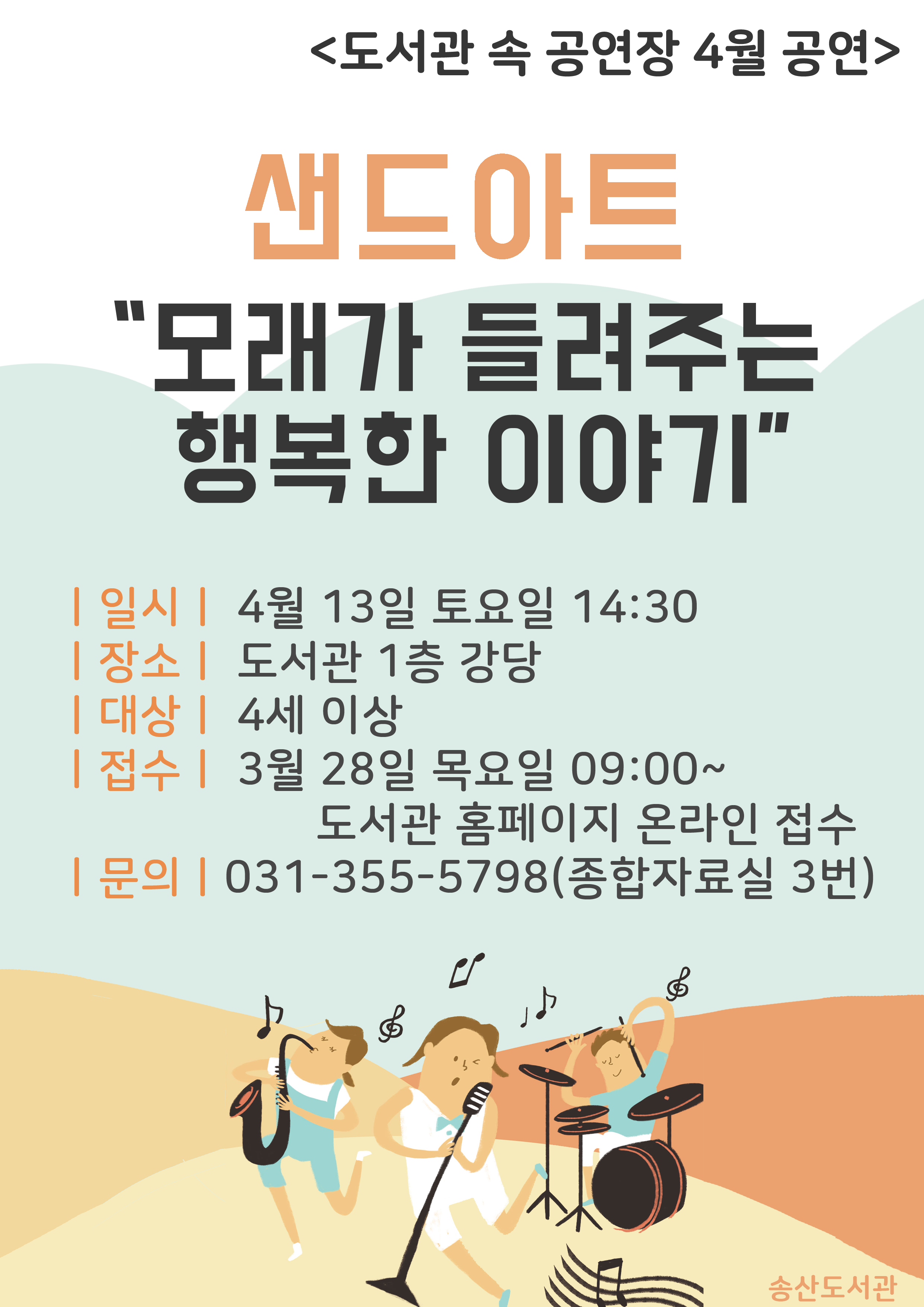 【[기 타] 행사】[연간공연] 도서관 속 공연장 4월 공연 '샌드아트' 장소 송산도서관 기간 2019년 4월 13일 ~ 2019년 4월 13일 공연시간 14:30 티켓정보 관람등급 4세 이상 문의 031-355-5798 [연간공연] 도서관 속 공연장 4월 공연 '샌드아트' 샌드아트.png [ Size : 63.45KB, Down : 232 ] 미리보기 다운로드 홍보문39.png [ Size : 820.34KB, Down : 392 ] 미리보기 다운로드 공연소개2.png [ Size : 623.99KB, Down : 282 ] 미리보기 다운로드 목록보기
