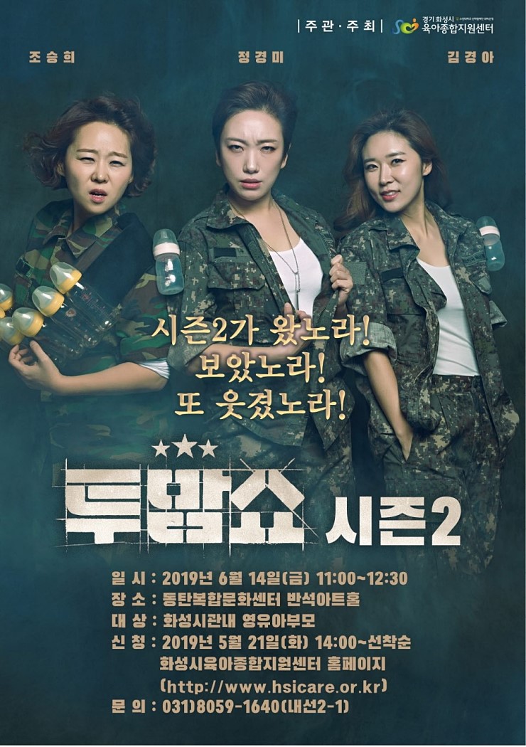 【[공 연]대관공연】육아종합지원센터 <투맘쇼> 장소 반석아트홀 기간 2019년 6월 14일 ~ 2019년 6월 14일 공연시간 11:00 티켓정보 관람등급 문의 031-8059-1640(화성시육아종합지원센터) - 20190613_100119.png [ Size : 2.97KB, Down : 177 ] 미리보기 다운로드 투맘쇼_홍보지(첨부파일2).jpg [ Size : 190.86KB, Down : 267 ] 미리보기 다운로드 목록보기