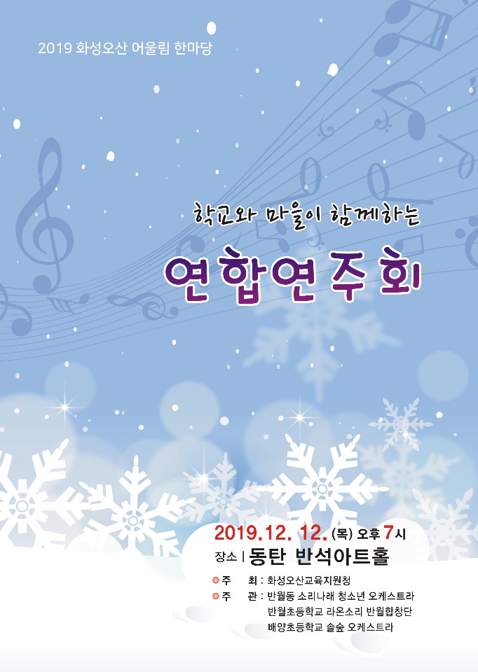 1. 화성오산 어울림 한마당 연합 연주회,장소:동탄복합문화센터 반석아트홀 ,기간:2019년 12월 12일~2019년 12월 12일