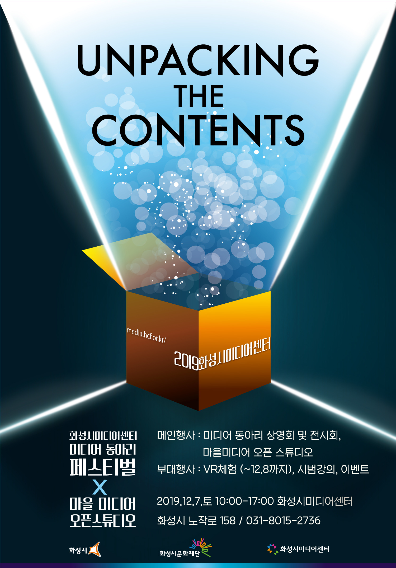화성시미디어센터에서는 오는 127일 미디어 동아리 페스티벌과 마을미디어 오픈스튜디오를 개최합니다. ‘UNPACKING THE CONTENTS’라는 주제로 다양한 미디어 작품이 전시, 상영회, 라디오방송 등을 통해 소개됩니다. 행사를 통해 1년 동안 미디어센터의 지원 속에 창작된 미디어 컨텐츠를 감상하실 수 있으며, 컨텐츠의 창작자와 함께 작품을 나누실 수 있습니다. 관심있는 시민 여러분의 많은 참여 바랍니다.