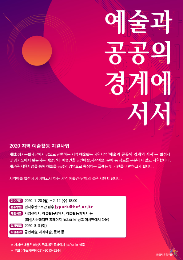(재)화성시문화재단에서 공모로 진행하는 지역 예술활동 지원사업은 지역예술 활성화를 위해 경기문화재단과 협업하여 진행하는 매칭 사업입니다. 화성시 및 경기도에서 활동하는 예술단체·예술인을 공연예술, 시각예술, 문학 등 장르를 구분하지 않고 지원합니다. 재단은 지원사업을 통해 예술을 공공의 영역으로 확장하는 플랫폼 및 기반을 마련하고, 시민들에게 다양한 문화향유 기회를 제공하고자 합니다. 지역예술 발전에 기여하고자 하는 지역 예술인·단체의 많은 지원 바랍니다.