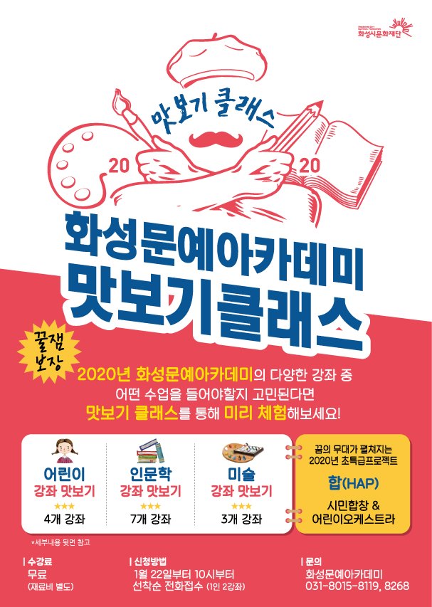 【[기 타] 행사】맛보기클래스:영화 속 클래식 감상(교양) 장소 동탄복합문화센터 M1층 영상교육실 기간 2020년 1월 28일 ~ 2020년 2월 3일 공연시간 15:00-16:00(1시간) 티켓정보 관람등급 성인 문의 031-8015-8119/8268 영화를 통해 클래식을 느껴볼 수 있는 시간 맛보기클래스_교양.png [ Size : 20.9KB, Down : 90 ] 미리보기 다운로드 화성문예아카데미_맛보기클래스.jpg [ Size : 101.92KB, Down : 103 ] 미리보기 다운로드 화성문예아카데미_맛보기클래스_02.jpg [ Size : 132.74KB, Down : 105 ] 미리보기 다운로드 목록보기