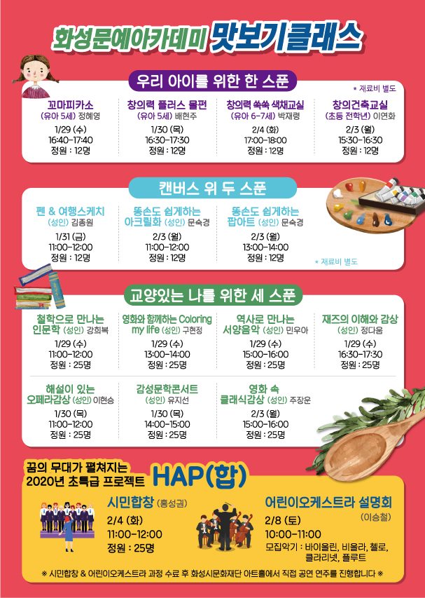【[기 타] 행사】맛보기클래스:재즈의 이해와 감상(교양) 장소 동탄복합문화센터 M1층 영상교육실 기간 2020년 1월 28일 ~ 2020년 1월 29일 공연시간 16:30-17:30(1시간) 티켓정보 관람등급 성인 문의 031-8015-8119/8268 접하기 어려웠던 재즈를 조금 더 쉽고 재미있게 다가가 볼수 있는 시간 맛보기클래스_교양.png [ Size : 20.9KB, Down : 86 ] 미리보기 다운로드 화성문예아카데미_맛보기클래스.jpg [ Size : 101.92KB, Down : 88 ] 미리보기 다운로드 83183548_3002969726400178_6382551904160841728_n.jpg [ Size : 124.23KB, Down : 86 ] 미리보기 다운로드 목록보기