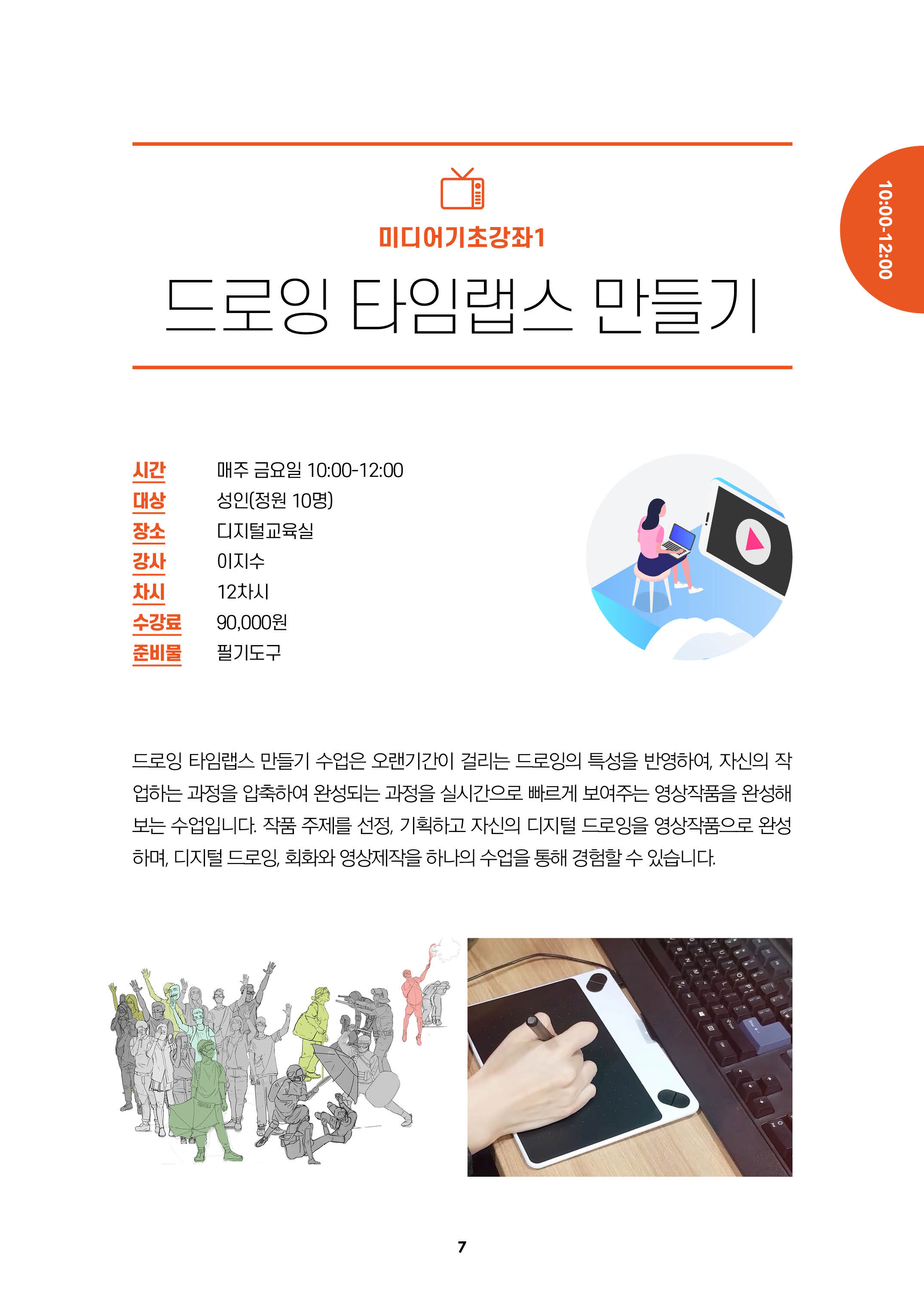 | 01 | 03/06 (금) | 오리엔테이션 | 디지털 드로잉의 특성과 타임랩스의 설명. 디지털 드로잉의 기본 환경 익히기와 프로그램 설명. 드로잉의 특성과 타입랩스 소프트웨어 알아보기. |