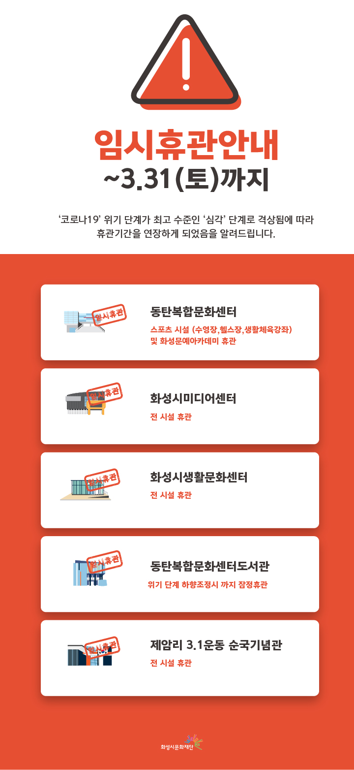 ‘코로나19’ 위기 단계가 최고 수준인 ‘심각’ 단계로 격상됨에 따라 임시휴관을 하게 되었음을 알려드립니다.