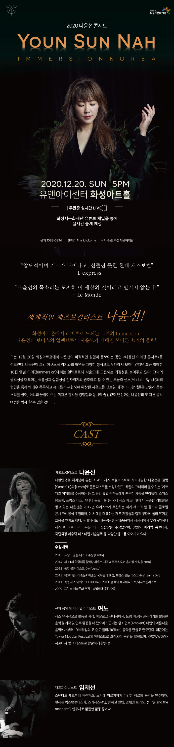 ![2020 나윤선 콘서트 Youn Sun Nah, Immersion Korea, 2020.12.20. SUN, 5PM, 유앤아이센터 화성아트홀, 무관중 실시간 LIVE, 화성시문화재단 유튜브 채널을 통해 실시간 중계 예정, 문의 1588-3254, 홈페이지 art.hcf.or.kr 주최/주관 화성시문화재단