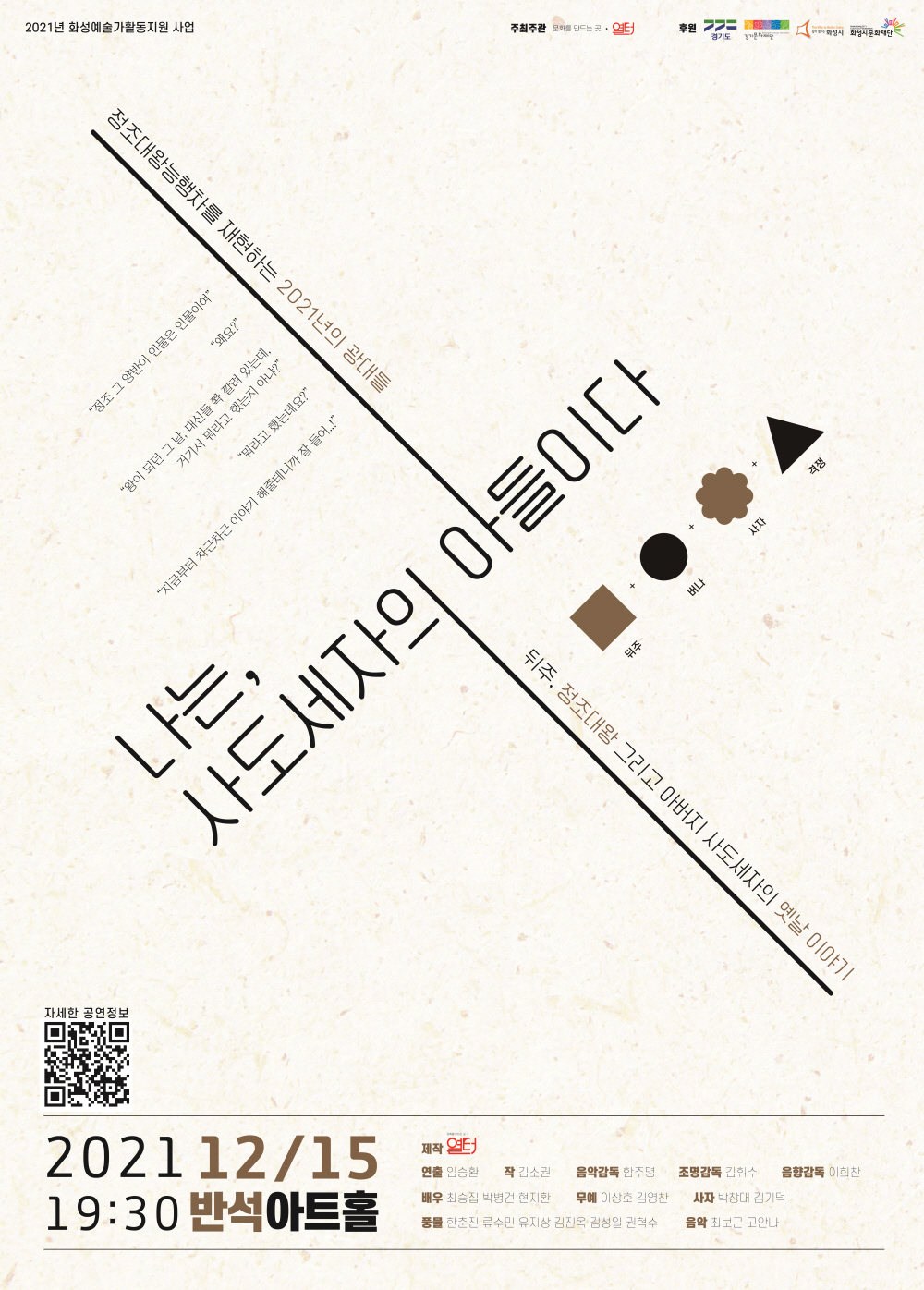 1. 창작연희극 <나는사도세자의아들이다>,장소:동탄복합문화센터 반석아트홀,기간:2021년 12월 15일~2021년 12월 15일