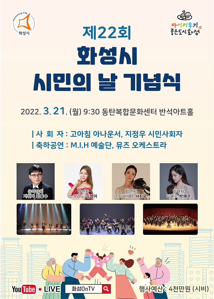 【[공 연]대관공연】2022년 제22회 화성시 시민의 날 기념식 장소 동탄복합문화센터 반석아트홀 기간 2022년 3월 21일 ~ 2022년 3월 21일 요일 월 공연시간 09:30~12:00 티켓정보 유튜브 생중계 관람등급 전체관람가 문의 031-8015-8153 화성OnTV 채널 주소https://www.youtube.com/user/ihbsgokr 아트홀_홈페이지_180x120.png [ Size : 18.8KB, Down : 68 ] 미리보기 다운로드 아트홀_홈페이지_180x120 재단홈페이지_문화캘린더_590x520.png [ Size : 109.07KB, Down : 58 ] 미리보기 다운로드 재단홈페이지_문화캘린더_590x520 상세페이지_가로750.png [ Size : 451.64KB, Down : 174 ] 미리보기 다운로드 상세페이지_가로750 목록보기