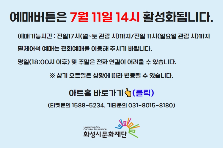예매 화성시문화재단 1588-5234 인터파크티켓 1544-1555 연령 초등학생 이상 관람가