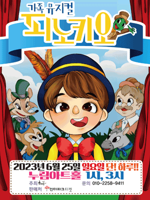 【[공 연]대관공연】가족뮤지컬 피노키오 장소 모두누림센터 누림아트홀 기간 2023년 6월 25일 ~ 2023년 6월 25일 요일 일 공연시간 2023년 6월 25일(일) 13:00, 15:00 티켓정보 1인 할인가 22,000원 관람등급 문의 요망 문의 010-2258-구사일일 본 공연은 대관공연입니다.자세한 내용은 문의처로 확인 부탁드립니다.인터파크 예매https://tickets.interpark.com/goods/23006158 목록이미지_희망극단.jpg [ Size : 342.86KB, Down : 884 ] 미리보기 다운로드 목록이미지_희망극단 포스터_희망극단.gif [ Size : 48.75KB, Down : 1,080 ] 미리보기 다운로드 포스터_희망극단 목록보기