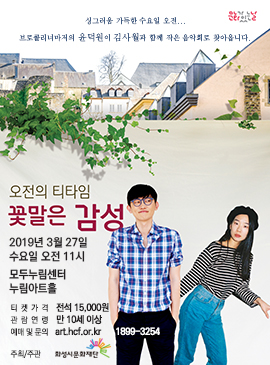 ![싱그러움 가득한 수요일 오전... 브로콜리너마저 윤덕원이 김사월과 함께 작은 음악회로 찾아옵니다. ,브로콜리너마저, 윤덕원의 11시 콘서트, 문화가 있는 날, 오전의 티타임 꽃말은 감성, 2019년 3월 27일 수요일 오전 11시, 모두누림센터 누림아트홀, 티켓가격 : 전석 15,000원, 관람연령 : 만 10세 이상, 예매 및 문의 : art.hcf.or.kr , 1899-3254, 주최/주관 : 화성시문화재단, 아티스트 소개, 어느새 닳아버린 삶의 순간들을 위로하는 노래, 싱어송라이터 윤덕원, 어떤 미사여구보다 강렬한 울림을 주는 담백한 가사로 씁쓸하지만 어쩔 수 없는, 우리 삶의 순간들을 함께 하고 있는 싱어송라이터 윤덕원. , 밴드 ‘브로콜리너마저’에서 작사/작곡/보컬을 맡고 있는 그는 솔로 성향이 짙은 곡들을 발표하며 싱어송라이터로서의 활동을 시작했다., 2014년 첫 디지털 싱글 [흐린 길], [비겁맨]을 시작으로 정규 1집 [흐린 길], 싱글 [축의금] 등을 발매했으며, 밴드 활동을 활발히 진행한 2017년에도 꾸준한 음악 작업을 시작으로 이를 발달시킨 윤덕원 소극장라이브 <흐린 길> 시리즈를 진행하며 밴드 활동과 솔로 단독 공연을 병행, 각기 다른 매력을 선보이기도 했다., 아직도 꿈꿀 수 있는 목소리의 세계, 싱어송라이터 김사월, 김사월은 2014년 김사월?김해원 데뷔 이후 자신만의 독창적인 영역을 선보인 포크 싱어송라이터이다. 대중음악상 최우수 포크음반상을 수상한 1집 [수잔](2015), 순간의 감정들을 과감히 기록한 라이브 앨범 [7102](2017), 사랑은 고독이라 말하는 [로맨스](2018)를 통해 불안한 현재를 살아가는 지금의 청춘들에게 공감과 위로를 전해왔다. 상실과 희망을 번복하는 김사월의 문학적 가사는 개인의 경험으로부터 출발하여 청자로 하여금 공감을 이끌어내는 힘을 가지고 있다. , Discography, 1집 [수잔] (2015), 라이브 앨범 [7102] (2017), 2집 [로맨스] (2018), 대표곡, 수잔 (1집), 너무 많은 연애 (7102), 달아 (7102), 누군가에게 (2집), 공연 안내, 공연 안내, 1. 본 공연은 무대 위에서 즐기는 하우스콘서트입니다. , 2. 티켓 예매 시 좌석을 지정하지 않는 비지정석 공연입니다. , 3. 공연 당일 선착순 입장입니다. , 4. 공연 종료 후 로비에서 다과가 제공됩니다. 2019년 상반기 공연 일정, 4월 24일 수요일 오전 11시 : 재즈의 진한 풍미를 담은 선율, 재즈 피아니스트 김주헌 + 윤덕원 , 5월 29일 수요일 오전 11시 , 씁쓸하면서도 달콤한 일상의 한 조각, 참깨와 솜사탕 + 윤덕원 , 6월 26일 수요일 오전 11시 , 따뜻하게 녹아드는 사랑스러운 멜로디, 최낙타 + 윤덕원, 누림아트홀오시는길:대중교통이용시:수원역:22-1(제부여객) 수원역(안산방향정류장)->매송->비봉->남양->시청