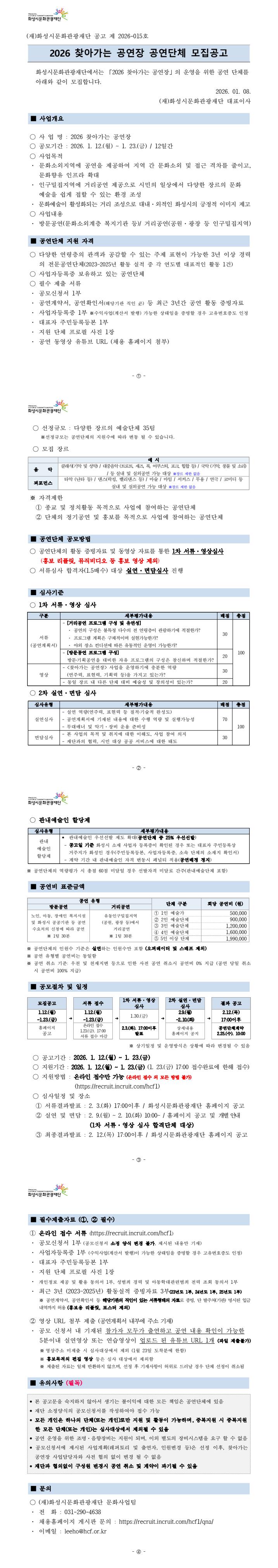 2026 찾아가는 공연장 공연단체 모집공고 작성자 관리자 작성일 2026년 1월 8일 11시 10분 59초 조회 541 2026 찾아가는 공연장 공연단체 공모 공고문(이미지).jpg [ Size : 393.17KB, Down : 99 ] 미리보기 다운로드 2026 찾아가는 공연장 공연단체 공모 공고문(이미지) 2026 찾아가는 공연장 공연단체 공모 공고문.hwp [ Size : 93KB, Down : 20 ] 다운로드 2026 찾아가는 공연장 공연단체 공모 공고문 지원하기: https://recruit.incruit.com/hcf1/job/2601080003 목록보기
