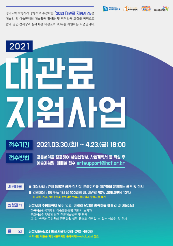 (재)화성시문화재단은 경기도와 화성시가 공동으로 주관하는 2021년 대관료 지원사업을 통해 관내 전문예술인·예술단체의 창작활동 활성화를 위한 전시·공연 대관료를 지원하고자 합니다. 지역 예술인·단체의 많은 참여 바랍니다.