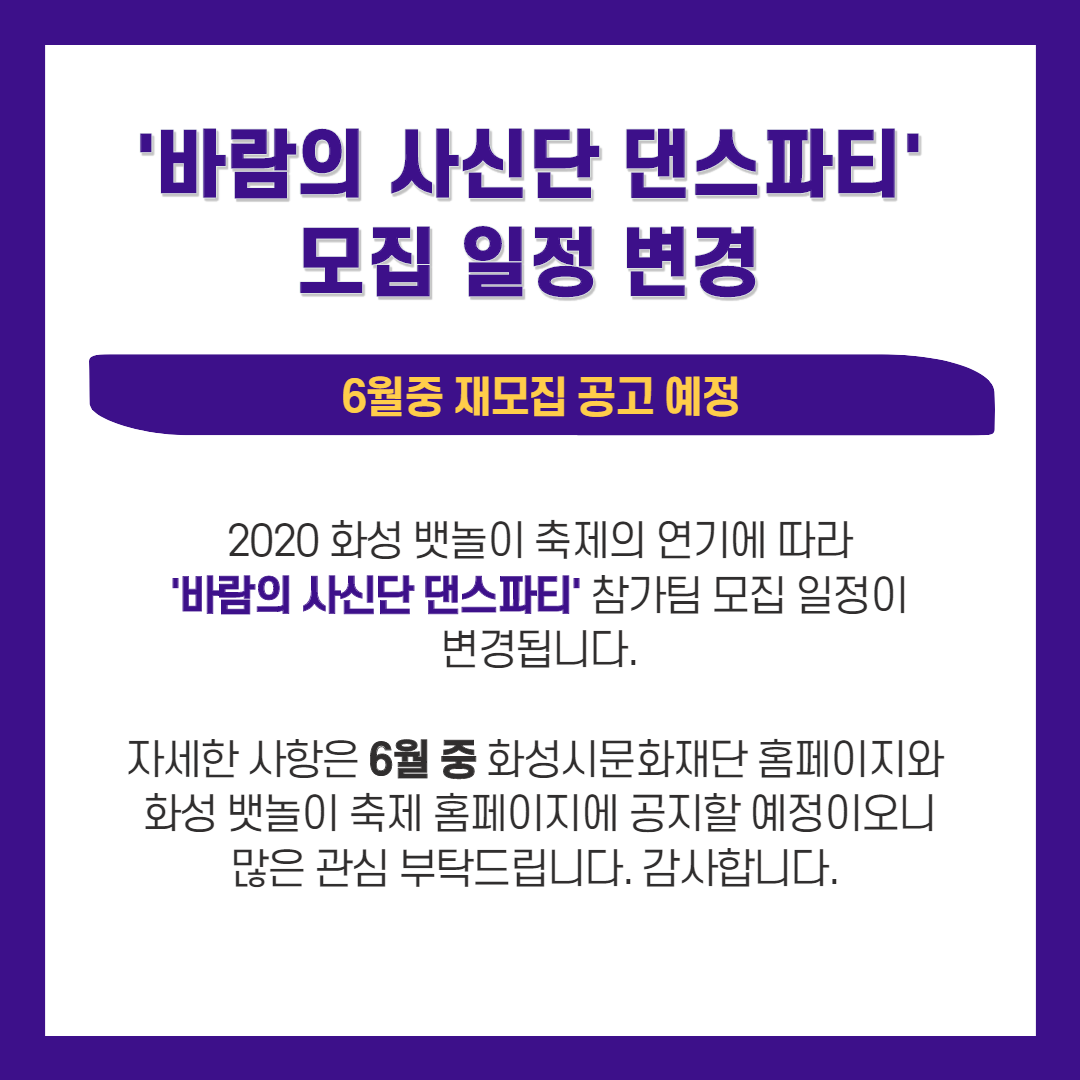 2020 화성뱃놀이 축제 <바람의 사신단> 모집 일정 6월 재공고 예정 안내 작성자 관리자 작성일 2020년 3월 24일 14시 15분 31초 조회 558 바람의 사신단 댄스파티 모집일정 변경.png [ Size : 131.62KB, Down : 345 ] 미리보기 다운로드 목록보기