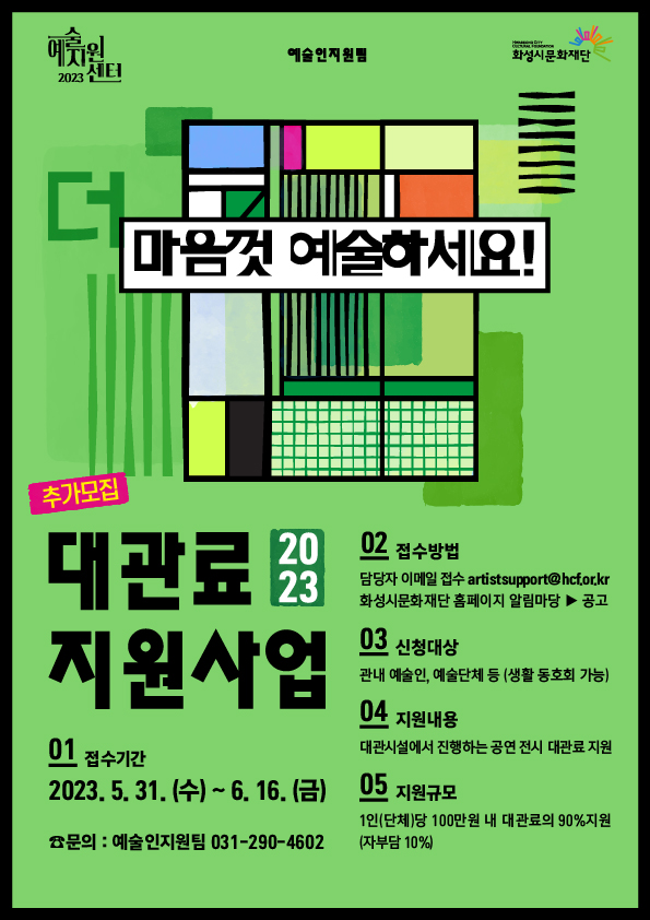 (재)화성시문화재단에서는 화성시 예술인·예술단체의 대관료 부담 완화와 이를 통한 공연, 전시 활성화로 시민의 예술 향유 기회를 확대하기 위해 <2023년 대관료 지원사업>을 공모합니다. 관심 있는 관내 예술인(단체)의 많은 참여 바랍니다. 2023. 5. 25. (재)화성시문화재단 대표이사 |