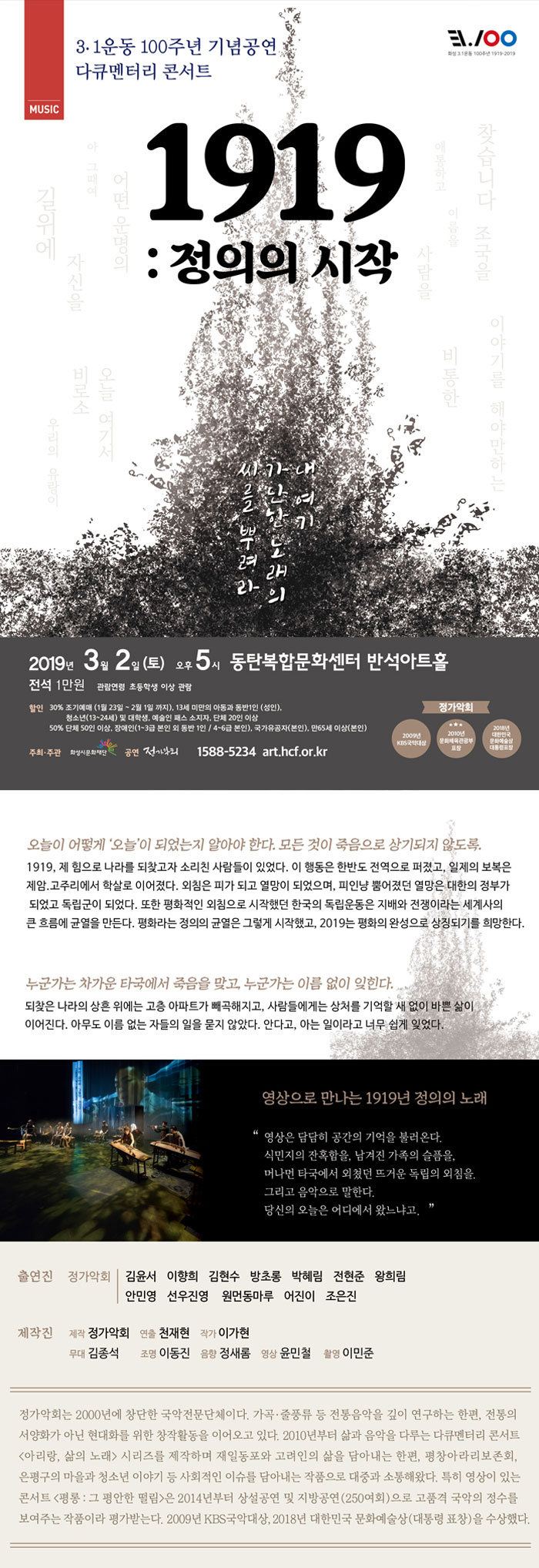 MUSIC, 3·1운동 100주년 기념공연 다큐멘터리 콘서트, 1919 : 정의의 시작, 2019년 3월 2일 (토) 오후 5시, 동탄복합문화센터 반석아트홀, 전석 1만원, 관람연령 : 초등학생 이상 관람, 할인 30% : 조기예매 (3월 15일 ~ 3월 24일 까지), 13세 미만의 아동과 동반1인(성인), 청소년(13~24세) 및 대학생, 예술인 패스 소지자, 단체 20인 이상, 할인 50% : 단체 50인 이상, 장애인(1~3급 본인 외 동반 1인/4~6급 본인), 국가유공자(본인), 만65세 이상(본인), 주최ㆍ주관 (재)화성시문화재단, 1588-5234, art.hcf.or.kr, 정가악회, 2009년 KBS 국악대상, 2010년 문화체육관광부 표창, 2018년 대한민국 문화예술상 대통령 표창, 오늘이 어떻게 오늘이 되었는지 알아야 한다. 모든 것이 죽음으로 상기되지 않도록. , 1919, 제 힘으로 나라를 되찾고자 소리친 사람들이 있었다. 이 행동은 한반도 전역으로 퍼졌고, 일제의 보복은 제암.고주리에서 학살로 이어졌다. 외침은 피가 되고 열망이 되었으며, 피인냥 뿜어졌던 열망은 대한의 정부가 되었고 독립군이 되었다. 또한 평화적인 외침으로 시작했더 한국의 독립운동은 지배와 전쟁이라는 세계사의 큰 흐름에 균열을 만든다. 평화라는 정의의 균열은 그렇게 시작했고, 2019는 평화의 완성으로 상징되기를 희망한다. , 누군가는 차가운 타국에서 죽음을 맞고, 누군가는 이름 없이 잊힌다. , 되찾은 나라의 상흔 위에는 고층 아파트가 빼곡해지고, 사람들에게는 상처를 기억할 새 없이 바쁜 삶이 이어진다. 아무도 이름 없는 자들의 일을 묻지 않았다. 안다고, 아는 일이라고 너무 쉽게 잊었다. , 영상으로 만나는 1919년 정의의 노래, 영상은 담담히 공간의 기억을 불러온다., 식민지의 잔혹함을, 남겨진 가족의 슬픔을, 머나먼 타국에서 외쳤던 뜨거운 독립의 외침을. , 그리고 음악으로 말한다. , 당신의 오늘은 어디에서 왔느냐고., 출연진 : 정가악회 : 김윤서, 이향희, 김현수, 방초롱, 박혜림, 전현준, 왕희림, 안민영, 선우진영, 원먼동마루, 어진이, 조은진, 제작진: 제작 : ㅜ정가악회, 연출 : 천재현, 작가 : 이가현, 무대: 김종석, 조명 : 이동진, 음향 : 정새롬, 영상 : 윤민철, 촬영 : 이민준, 정가악회는 2000년에 창단한 국악전문단체이다. 가곡·줄풍류 등 전통음악을 깊이 연구하는 한편, 전통의 서양화가 아닌 현대화를 위한 창작활동을 이어오고 있다. 2010년부터 삶과 음악을 다루는 다큐멘터리 콘서트 <아리랑, 삶의 노래> 시리즈를 제작하며 재일동포와 고려인의 삶을 담아내는 한편, 평창아라리보존회, 은평구의 마을과 청소년 이야기 등 사회적인 이슈를 담아내는 작품으로 대중과 소통해왔다. 특히 영상이 있는 콘서트 <평롱 : 그 평안한 떨림>은 2014년부터 상설공연 및 지방공연(250여회)으로 고품격 국악의 정수를 보여주는 작품이라 평가받는다. 2009년 KBS국악대상, 2018년 대한민국 문화예술상(대통령 표창)을 수상했다..jpg