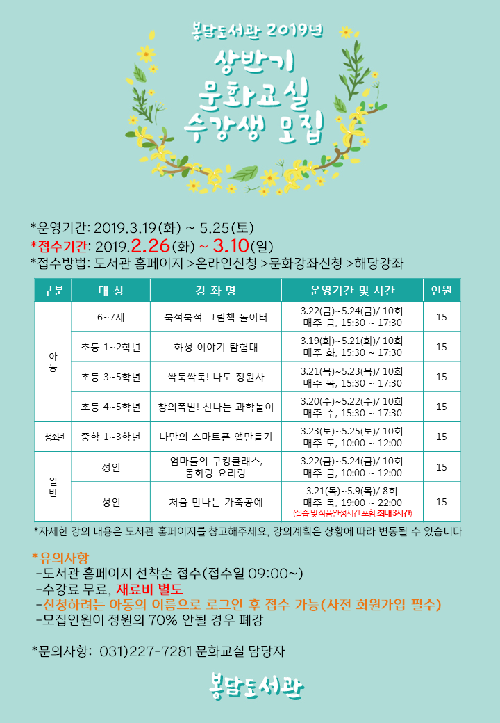 1. 봉담도서관 2019 상반기 문화교실 수강생 모집,장소:,기간:2019년 2월 26일~2019년 3월 10일