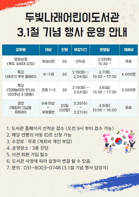 1. 3.1절 기념행사_영화상영 : 독도 수비대 강치,장소:두빛나래어린이도서관,기간:2019년 2월 28일~2019년 2월 28일