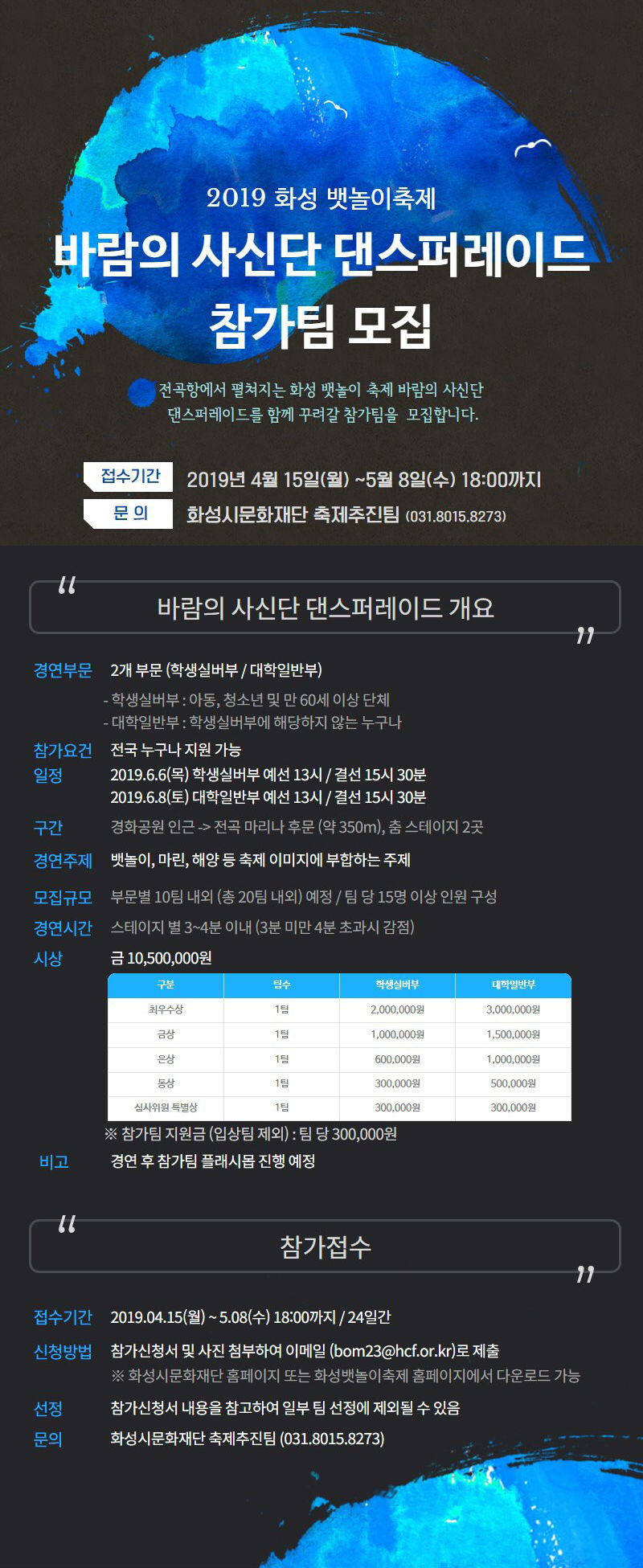 【[축 제]화성 뱃놀이 축제】『2019 화성 뱃놀이 축제』 바람의 사신단 댄스퍼레이드 참가팀 모집 장소 기타 기간 2019년 4월 15일 ~ 2019년 5월 8일 공연시간 티켓정보 관람등급 문의 031-8015-8273 『2019 화성 뱃놀이 축제』 바람의 사신단 댄스퍼레이드 참가 신청바로가기↓↓↓↓↓http://www.hcf.or.kr/hcf/59?action-value=5c9977b4a9b654184d296c29632dfdd6&action=read&chathead=%ED%99%94%EC%84%B1%EC%8B%9C%EB%AC%B8%ED%99%94%EC%9E%AC%EB%8B%A8 문화캘린더1.jpg [ Size : 56.7KB, Down : 417 ] 미리보기 다운로드 참가모집1.JPG [ Size : 125.5KB, Down : 396 ] 미리보기 다운로드 2019화성 뱃놀이 축제 바람의 사신단 댄스퍼레이드 참가팀 모집 ,기간:2019년 4월 15일~2019년 5월8일 바람의 사신단 댄스퍼레이드 모집 공고.jpg [ Size : 286.71KB, Down : 991 ] 미리보기 다운로드 목록보기