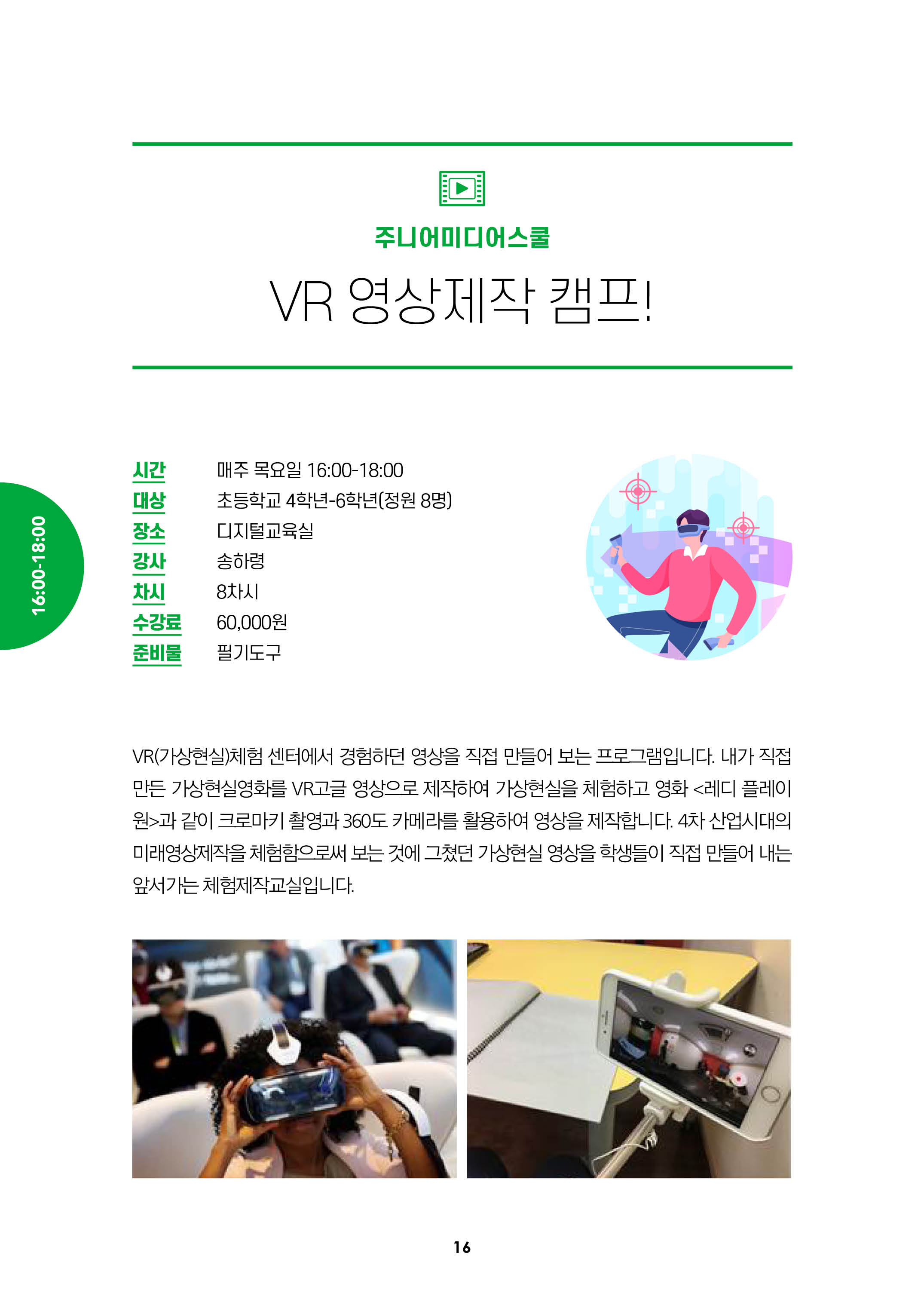 주니어미디어스쿨/VR영상제작캠프!/시간:매주목요일 16:00-18:00, 대상:초등학교 4학년-6학년(정원8명), 장소:디지털교육실, 강사:송하령, 차시:8차시, 수강료:6만원, 준비물:필기도구/