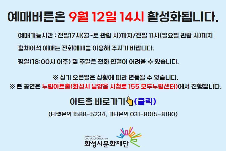 예매 화성시문화재단 www.hcf.or.kr 1588-5234 인터파크티켓 1544-1555 연령 만 7세 이상 관람가 티켓 전석 2만원