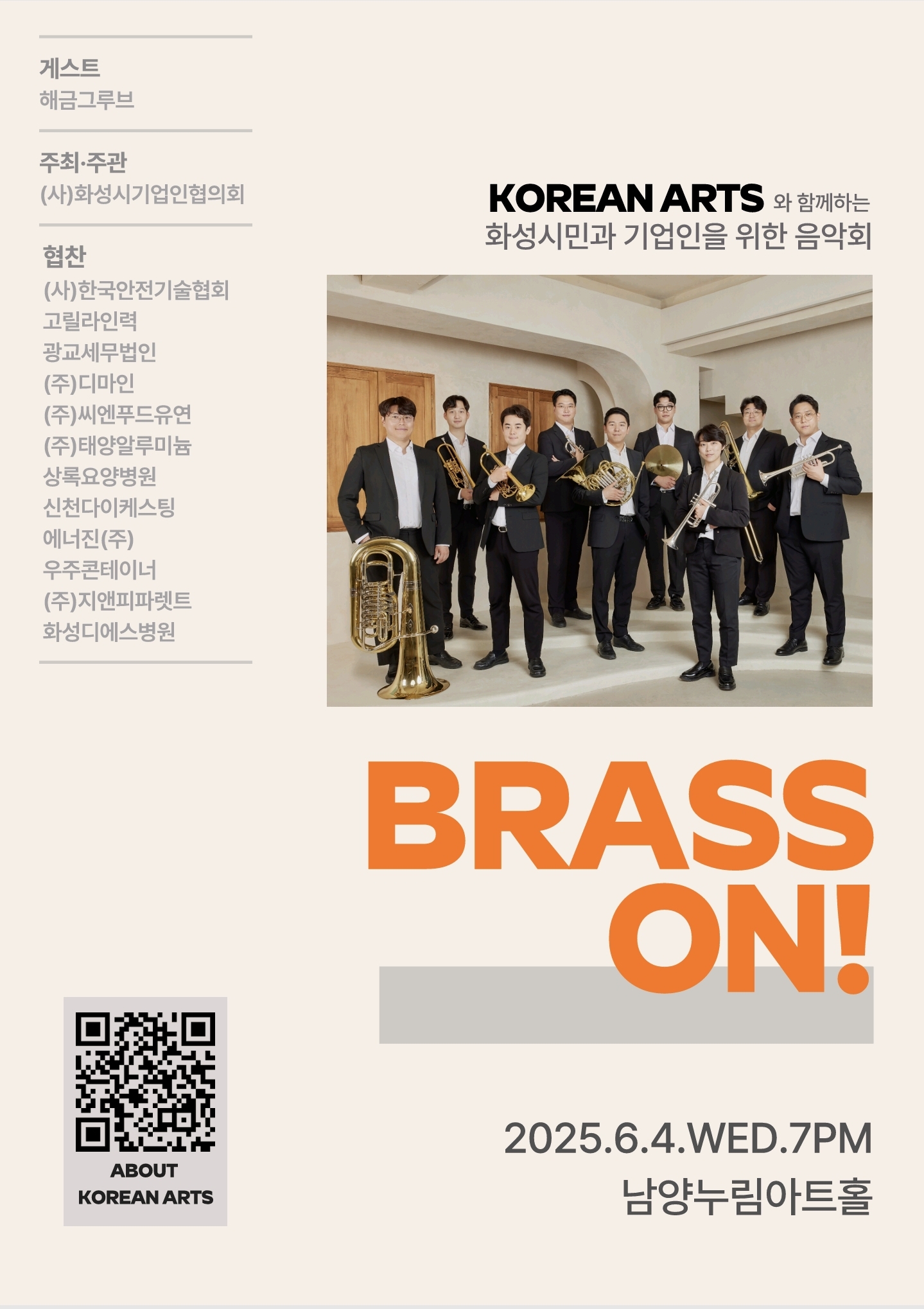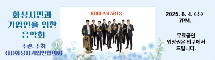 【[공 연]대관공연】화성시민과 기업인을 위한 음악회 장소 누림아트홀 기간 2025년 6월 4일 ~ 2025년 6월 4일 요일 수 공연시간 2025년 6월 4일(토) 19:00 소요시간 100분 티켓정보 무료 (1인 1티켓 필수) 관람등급 전체관람가 문의 031)8055-8259 티켓문의 : 031-8055-8259 화성시민과 기업인을 위한 음악회1.png [ Size : 37.92KB, Down : 134 ] 미리보기 다운로드 화성시민과 기업인을 위한 음악회1 음악회 포스터.jpg [ Size : 769.02KB, Down : 411 ] 미리보기 다운로드 음악회 포스터 화성시민과 기업인을 위한 음악회( 2).png [ Size : 141.2KB, Down : 403 ] 미리보기 다운로드 화성시민과 기업인을 위한 음악회( 2) 목록보기