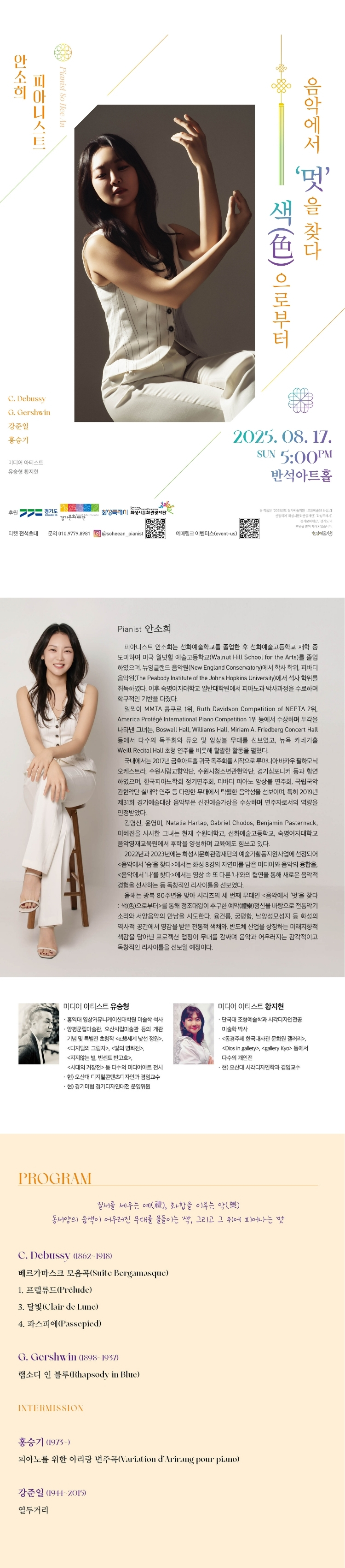 【[공 연]대관공연】음악에서 ‘멋’을 찾다 : 색(色)으로부터 장소 반석아트홀 기간 2025년 8월 17일 ~ 2025년 8월 17일 요일 일 공연시간 17:00 티켓정보 전석 초대 관람등급 전체 관람가 문의 0l0-9779-8981 문의: 0l0-9779-8981 안소희_목록이미지.jpg [ Size : 25.71KB, Down : 71 ] 미리보기 다운로드 안소희_목록이미지 안소희_포스터(A4).jpg [ Size : 847.47KB, Down : 71 ] 미리보기 다운로드 안소희_포스터(A4) 안소희_상세이미지.jpg [ Size : 1.2MB, Down : 583 ] 미리보기 다운로드 안소희_상세이미지 목록보기