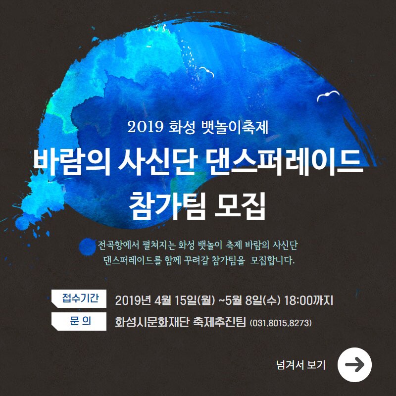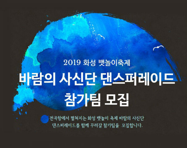 【[축 제]화성 뱃놀이 축제】『2019 화성 뱃놀이 축제』 바람의 사신단 댄스퍼레이드 참가팀 모집 장소 기타 기간 2019년 4월 15일 ~ 2019년 5월 8일 공연시간 티켓정보 관람등급 문의 031-8015-8273 『2019 화성 뱃놀이 축제』 바람의 사신단 댄스퍼레이드 참가 신청바로가기↓↓↓↓↓http://www.hcf.or.kr/hcf/59?action-value=5c9977b4a9b654184d296c29632dfdd6&action=read&chathead=%ED%99%94%EC%84%B1%EC%8B%9C%EB%AC%B8%ED%99%94%EC%9E%AC%EB%8B%A8 문화캘린더1.jpg [ Size : 56.7KB, Down : 423 ] 미리보기 다운로드 참가모집1.JPG [ Size : 125.5KB, Down : 399 ] 미리보기 다운로드 2019화성 뱃놀이 축제 바람의 사신단 댄스퍼레이드 참가팀 모집 ,기간:2019년 4월 15일~2019년 5월8일 바람의 사신단 댄스퍼레이드 모집 공고.jpg [ Size : 286.71KB, Down : 1,013 ] 미리보기 다운로드 목록보기