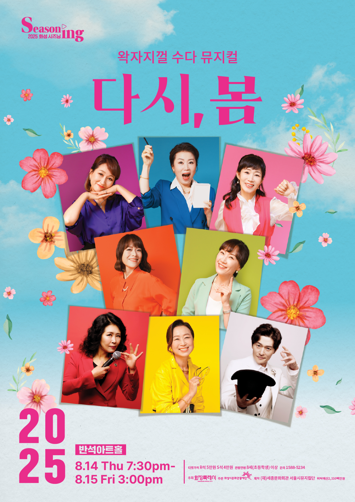 Seasoning 2025 화성 시즈닝 왁자지껄 수다 뮤지컬 다시,봄 2025 반석아트홀 8.14 Thu 7 30 pm 8.15 Fri 300 pm 티켓가격 R석 5만원 S석 4만원 관람연령 8세(초등학생)이상 문의 1588 5234 주최 화성특례시 주관 화성시문화관광재단 제작 (재)세종문화회관 서울시뮤지컬단 위탁예산 2,330백만원