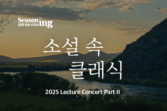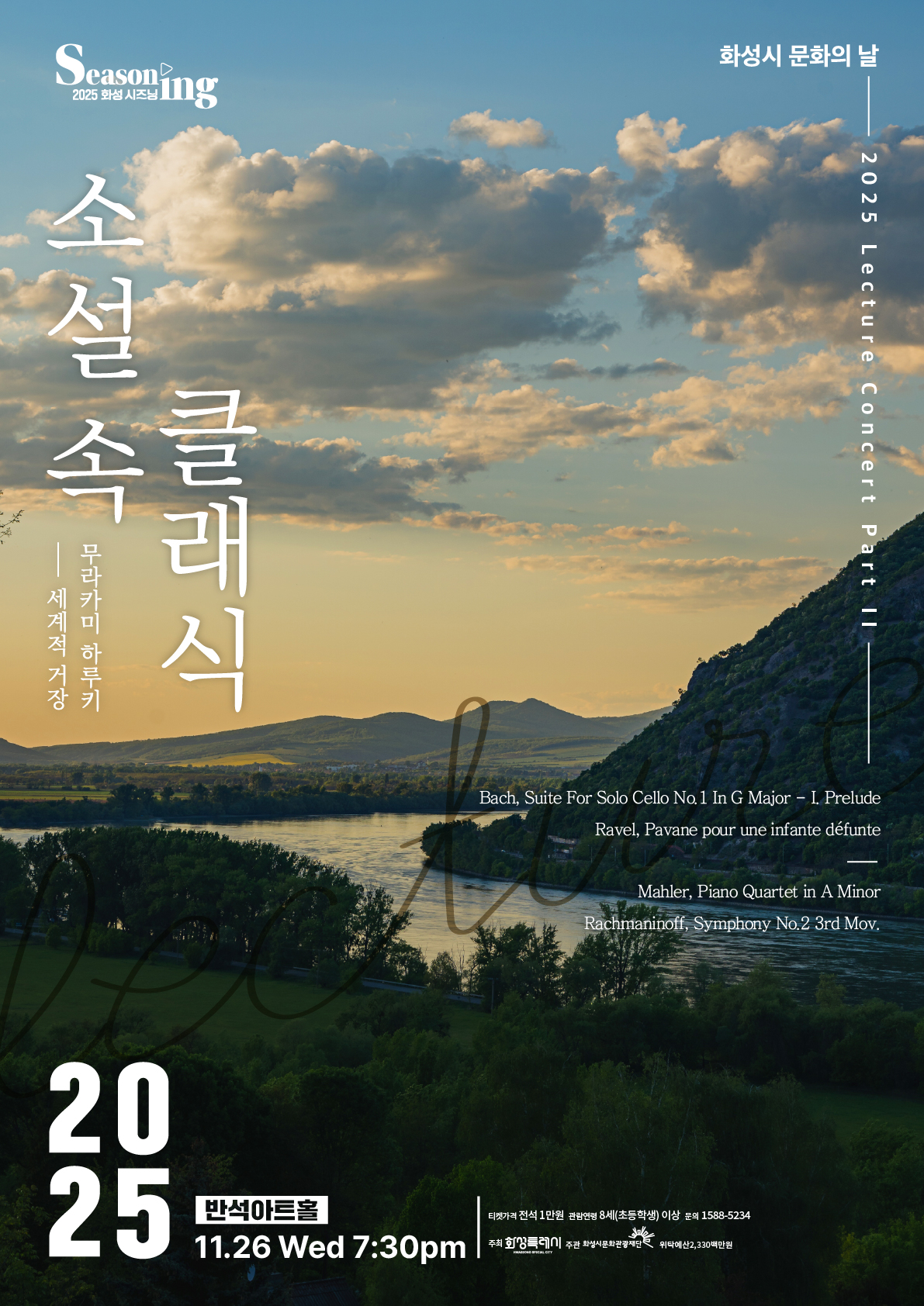 【[공 연]기획공연】[화성시 문화의 날] 렉처 콘서트 PARTII <소설 속 클래식> 장소 반석아트홀 기간 2025년 11월 26일 ~ 2025년 11월 26일 요일 수 공연시간 19:30(70분) 티켓정보 전석 1만원 관람등급 8세(초등학생) 이상 관람가 문의 1588-5234 ※예매 바로가기 버튼은 7월 1일(화) 17시에 활성화됩니다. ㄹㅔㄱㅊㅓㅋㅗㄴㅅㅓㅌㅡ_ㅅㅗㅅㅓㄹㅅㅗㄱ ㅋㅡㄹㄹㅐㅅㅣㄱ.jpg [ Size : 171.16KB, Down : 151 ] 미리보기 다운로드 ㄹㅔㄱㅊㅓㅋㅗㄴㅅㅓㅌㅡ_ㅅㅗㅅㅓㄹㅅㅗㄱ ㅋㅡㄹㄹㅐㅅㅣㄱ (포스터 최종)11.26_렉처콘서트_소설 속 클래식.jpg [ Size : 1.31MB, Down : 151 ] 미리보기 다운로드 (포스터 최종)11.26_렉처콘서트_소설 속 클래식 상세페이지_소설 속 클래식_최종본.jpg [ Size : 2.54MB, Down : 7,187 ] 미리보기 다운로드 상세페이지_소설 속 클래식_최종본 목록보기