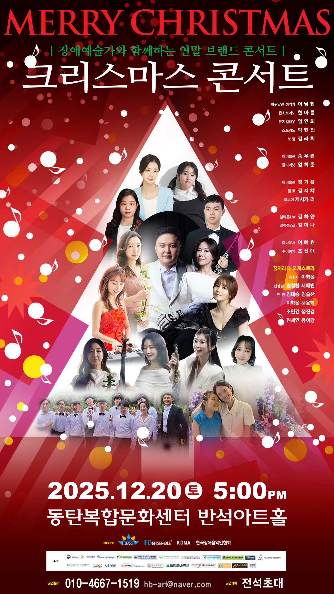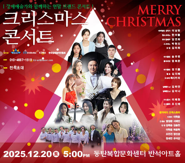 【[공 연]대관공연】CHRISTMAS CONCERT 장소 반석아트홀 기간 2025년 12월 20일 ~ 2025년 12월 20일 요일 금 공연시간 17:00 티켓정보 전석초대 관람등급 6세 이상 문의 HB ART 010-4667-**** 티켓신청 링크: https://naver.me/5XpeK2zP 포스터.jpg [ Size : 355.36KB, Down : 11 ] 미리보기 다운로드 포스터.jpg [ Size : 355.36KB, Down : 10 ] 미리보기 다운로드 목록보기