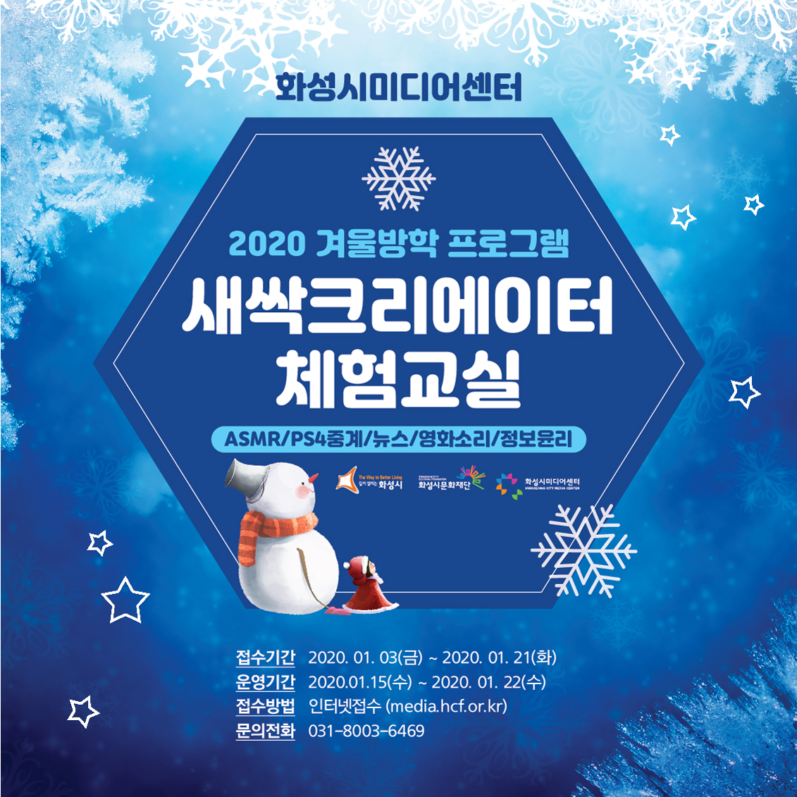 【[기 타] 행사】2020 겨울방학프로그램_새싹크리에이터 체험교실 장소 화성시미디어센터 기간 2020년 1월 15일 ~ 2020년 1월 22일 공연시간 티켓정보 관람등급 초1-중3 문의 031-8003-6469 <화성시미디어센터 겨울방학 프로그램>수강신청 바로가기 [외벽]겨울방중프로그램.jpg [ Size : 857.01KB, Down : 179 ] 미리보기 다운로드 새싹크리에이터_전단(앞면).jpg [ Size : 1.02MB, Down : 557 ] 미리보기 다운로드 새싹크리에이터_전단(뒷면).jpg [ Size : 1.09MB, Down : 518 ] 미리보기 다운로드 목록보기