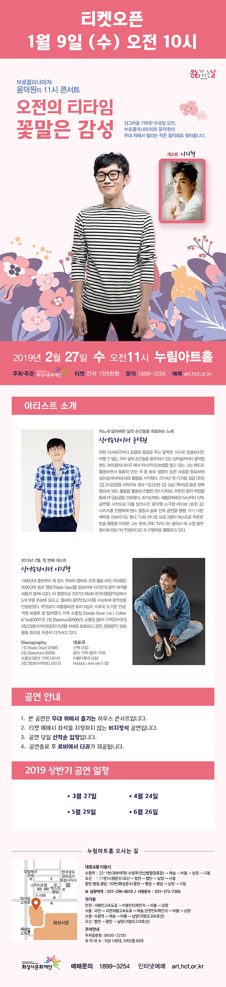 ![티켓오픈 1월 9일 (수) 오전 10시, 브로콜리너마저, 윤덕원의 11시 콘서트, 문화가 있는 날, 오전의 티타임 꽃말은 감성, 싱그러움 가득한 수요일 오전... 브로콜리너마저 윤덕원이 김사월과 함께 작은 음악회 로 찾아옵니다. ,게스트 이지형, 2019년 2월 27일 수 오전 11시, 누림아트홀, 주최ㆍ주관 (재)화성시문화재단, 티켓 전석 1만5천원, 문의 : 1588-5234,예매 : art.hcf.or.kr , 아티스트 소개, 어느새 닳아버린 삶의 순간들을 위로하는 노래, 싱어송라이터 윤덕원, 어떤 미사여구보다 강렬한 울림을 주는 담백한 가사로 씁쓸하지만 어쩔 수 없는, 우리 삶의 순간들을 함께 하고 있는 싱어송라이터 윤덕원. , 밴드 ‘브로콜리너마저’에서 작사/작곡/보컬을 맡고 있는 그는 솔로 성향이 짙은 곡들을 발표하며 싱어송라이터로서의 활동을 시작했다., 2014년 첫 디지털 싱글 [흐린 길], [비겁맨]을 시작으로 정규 1집 [흐린 길], 싱글 [축의금] 등을 발매했으며, 밴드 활동을 활발히 진행한 2017년에도 꾸준한 음악 작업을 통해 EP [농담]을 선보였다. 2015년에는 세종문화회관 M시어터 단독 공연을 시작으로 이를 발전시킨 윤덕원 소극장라이브 <흐린 길> 시리즈를 진행하며 밴드 활동과 솔로 단독 공연을 병행, 각기 다른 매력을 선보이기도 했다. TV와 라디오 프로그램의 게스트로 꾸준한 방송 활동을 이어온 그는 현재 JTBC '차이나는 클라스'에 고정 출연중이며 EBS FM '인생라디오'의 진행자로 활동하고 있다. , 2019년 2월, 첫 번째 게스트, 싱어송라이터 이지형, 1990년대 중반부터 록 밴드 위퍼의 멤버로 오랜 활동 하던 이지형은 2006년에 솔로 앨범 [Radio Days]를 발표하며 자신만의 음악 세계를 새롭게 펼쳐나갔다. 이 앨범으로 2007년 제4회 한국대중음악상에서 5개 부문 후보에 오르고, '올해의 음악인(남자)'을 수상하며 음악성을 인정받았다. 무엇보다 대중들에겐 토이 6집의 수록곡 '뜨거운 안녕' 객원 보컬로 잘 알려졌다. 이후 소품집 [Barista Music Vol. Coffee & Tea](2007년), 2집 [Spectrum](2008년), 소품집 [봄의 기적](2010년), 3집 [청춘마끼아또](2012년)을 차례로 발표하고 공연, 영화음악, 방송 활동 등으로 꾸준히 다가서고 있다. , Discography, 1집 [Radio Days](2006), 2집 [Spectrum](2008) , 소품집 [봄의 기적](2010), 3집 [청춘마끼아또](2012), 대표곡, 산책(2집), 봄의 기적 (봄의 기적), 아름다웠네 (3집), Nobody Likes Me (1집) , 공연 안내, 1. 본 공연은 무대 위에서 즐기는 하우스 콘서트입니다. , 2. 티켓 예매시 좌석을 지정하지 않는 비지정석 공연입니다. , 3. 공연 당일 선착순 입장입니다. , 4. 공연종료 후 로비에서 다과가 제공됩니다. , 2019 상반기 공연 일정, 3월 27일, 4월 24일, 5월 29일, 6월 26일, 누림아트홀오시는길:대중교통이용시:수원역:22-1(제부여객) 수원역(안산방향정류장)->매송->비봉->남양->시청