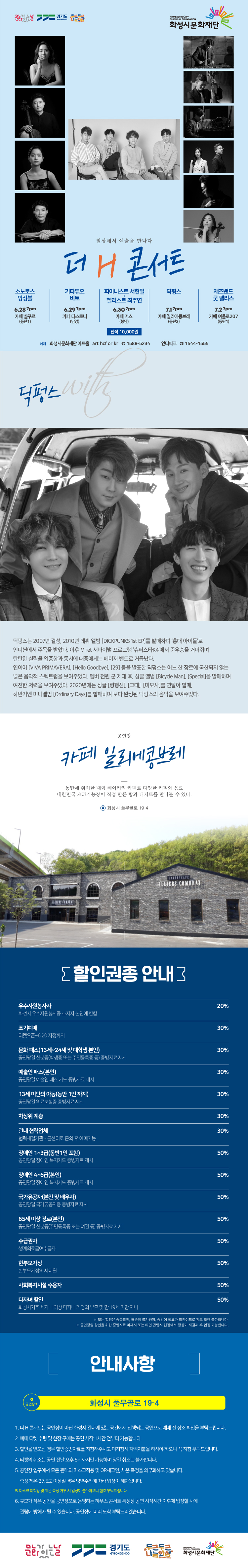 1. 더 H 콘서트는 공연장이 아닌 화성시 관내에 있는 공간에서 진행되는 공연으로 예매 전 장소 확인을 부탁드립니다.