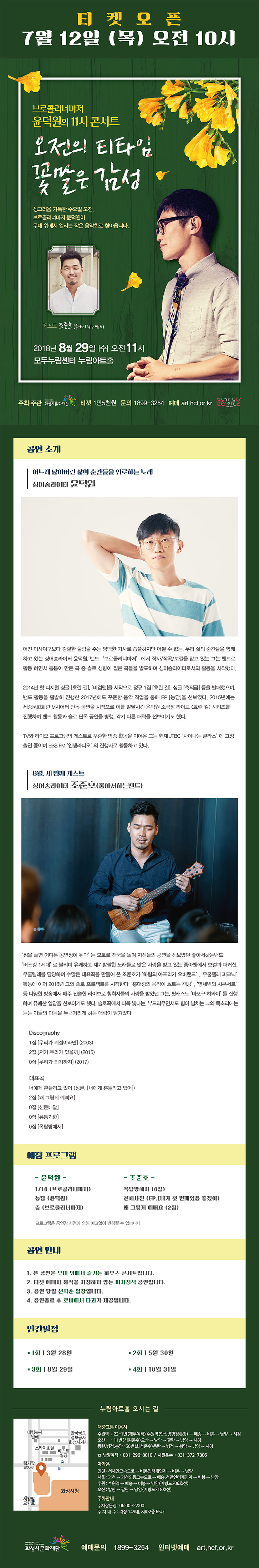 ![티켓오픈, 7월12일, 목요일, 오전 10시, 브로콜리너마저, 윤덕원의 11시 콘서트, 오전의 티타임, 꽃말은 감성, 싱그러움 가득한 수요일 오전, 브로콜리 너마저 윤덕원이, 무대위에서 열리는 작은 음악회로 찾아옵니다., 게스트, 조준호, 좋아서 하는 밴드, 2018년8월29일, 수, 오전11시, 모두누림센터, 누림아트홀, 주최, 주관, 화성시문화재단, 티켓, 1만5천원, 문의, 1899-3254, 예매, art.hcf.or.kr,문화가 있는 날, 공연소개, 어느새 닳아버린 삶의 순간들을 위로하는 노래, 싱어송라이터, 윤덕원, 어떤 미사여구보다, 강렬한 울림을 주는, 담백한 가사로 씁쓸하지만 어쩔 수 없는, 우리 삶의 순간들을 함께 하고 있는 싱어송라이터, 윤덕원, 밴드 '브로콜리너마저', 에서 작사, 작곡, 보컬을 맡고 있는 그는 밴드로 활동 하면서, 틈틈이 만든 곡 중 솔로 성향이 짙은, 곡들을 발표하며 싱어송라이터로서의 활동을 시작했다.,2014년 첫 디저털 싱글, 흐린길, 비겁맨을 시작으로 정규1집, 흐린길, 싱글, 축의금, 등을 발매했으며, 밴드 활동을 활발히 진행한, 2017년에도, 꾸준한 음악 작업을 통해, EP농담을 선보였다., 2015년에는 , 세종문화회관, M시어터 , 단독공연을 시작으로, 이를 발달시킨, 윤덕원 소극장 라이브[흐린길], 시리즈를 진행하며, 밴드 활동과 솔로 단독 공연을 병행, 각기 다른 매력을 선보이기도 했다., TV와 라디오 프로그램의 게스트로 꾸준한 방송 활동을 이어온, 그는 현재 JTBC,'차이나는 클라스'에 고정, 출연 중이며, EBS FM'인생라디오'의 진행자로 활동하고 있다., 8월, 세번째 게스트, 싱어송라이터, 조준호, (좋아서하는밴드), '짐을 풀면 어디든 공연장이 된다', 는 모토로 전국을 돌며 자신들의 공연을 선보였던 좋아서하는밴드, '버스킹 1세대'로 불리며 유쾌하고 재기발랄한 노래들로 많은 사랑을 받고 있는 좋아밴에서 보컬과 퍼커션, 우쿨렐레를 담당하며 수많은 대표곡을 만들어 온 조준호가, '하림의 아프리카 오버랜드', '우쿨렐레 피크닉'활동에 이어, 2018년 그의 솔로 프로젝트를 시작한다., '홍대광의 음악이 흐르는 책방', '명세빈의 시콘서트', 등 다양한 방송에서, 매주 진솔한 라이브로 청취자들의 사랑을 받았던 그는, 팟캐스트, '마포구 하와이', 를 진행하며,유쾌한 입담을 선보이기도 했다., 솔로곡에서 더욱 빛나는, 부드러우면서도 힘이 넘치는 그의 목소리에는 듣는 이들의 마음을 두근거리게 하는 매력이 담겨있다., Discofraphy, 1집, [우리가 계절이라면], 2집,[왜 그렇게 예뻐요],0집, [신문배달],0집,[유통기한],0집,[옥탑방에서],예정프로그램, 윤덕원, 1/10, 브로콜리너마저, 농담, 윤덕원, 춤, 브로콜리너마저, 조준호, 옥탑방에서, 0집, 천체사진, EP내가 첫 번째였음 좋겠어, 왜그렇게 예뻐요, 2집, 프로그램은 공연장 사정에 의해 예고없이 변경될 수 있습니다., 공연안내, 1. 본 공연은 무대위에서 즐기는 하우스 콘서트 입니다., 2. 티켓예매시 좌석을 지정하지 않는 비지정석 공연입니다., 3.공연당일 선착순 입장입니다., 4.공연종료후 로비에서 다과가 제공됩니다., 연간일정, 1회, 3월28일, 2회, 5월 30일, 3회 8월29일, 4회, 10월 31일, 누림아트홀 오시는길, 대중교통이용시, 수원역, 오산, 동탄병점봉담, 자가용, 인천, 서울, 수원, 오산, 주차안내, 주차장운영,06:00~22:00, 주차대수, 지상 149대, 지하2층 65대, 화성시문화재단, 예매문의, 1899-3254, 인터넷 예매, art.hcf.or.kr.jpg](/File/Download/fd89b246b41c300d30f1b5f965acd693)