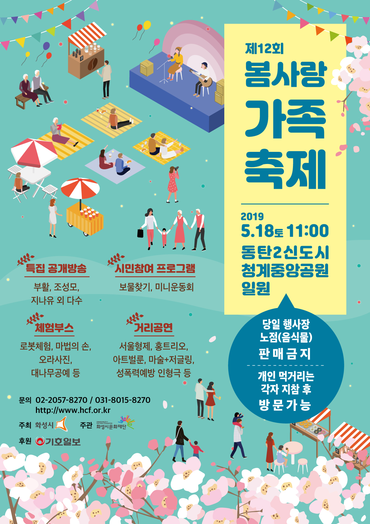 【[축 제]봄 사랑 가족축제】제 12회 봄사랑가족축제 장소 동탄2신도시 청계중앙공원 일원 기간 2019년 5월 18일 ~ 2019년 5월 18일 공연시간 11:00 티켓정보 관람등급 문의 02-2057-8270 / 031-8015-8270 제 12회 봄사랑가족축제 봄사랑가족축제_180x120.jpg [ Size : 14.09KB, Down : 534 ] 미리보기 다운로드 제12회 봄사랑가족축제_poster.jpg [ Size : 1005.4KB, Down : 2,745 ] 미리보기 다운로드 제 12회 봄사랑가족축제,장소:동탄2신도시 청계중앙공원 일원 ,기간:2019년 5월 18일 ~ 2019년 5월 18일 목록보기