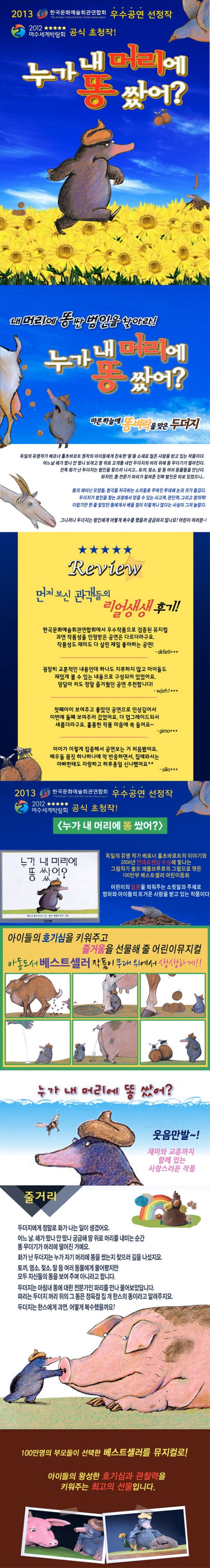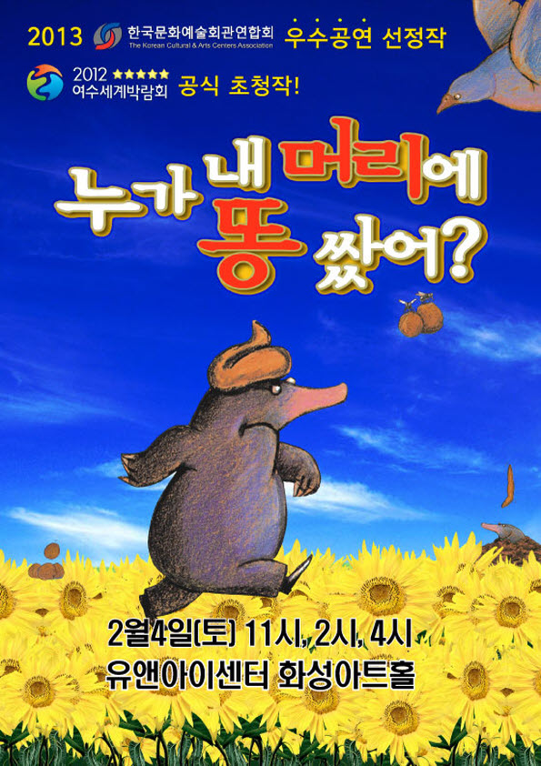 【[공 연]대관공연】어린이 베스트셀러 뮤지컬 〈누가 내머리에 똥쌌어?〉 장소 유앤아이센터 화성아트홀 기간 2023년 2월 4일 ~ 2023년 2월 4일 요일 토 공연시간 2023년 2월 4일(토) 11:00, 14:00, 16:00 티켓정보 R석 40,000원 S석(2층) 30,000원 관람등급 24개월 이상 문의 1599-9354 인터파크 예매처 바로가기https://tickets.interpark.com/goods/22017367 목록이미지_오름기획.jpg [ Size : 63.04KB, Down : 830 ] 미리보기 다운로드 목록이미지_오름기획 포스터_내머리똥.jpg [ Size : 226.36KB, Down : 1,623 ] 미리보기 다운로드 포스터_내머리똥 상세_오름기획.jpg [ Size : 718.85KB, Down : 1,600 ] 미리보기 다운로드 상세_오름기획 목록보기