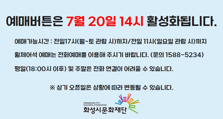 예매 화성시문화재단 www.hcf.or.kr 1588-5234 인터파크티켓 1544-1555 연령 36개월 이상 관람가 티켓 전석 2만원