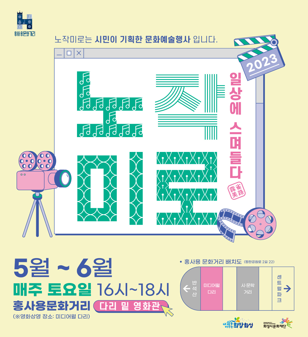 5월~6월 매주토요일 16시~18시 홍사용문화거리 다리밑영화관(영화상영장소:미디어월다리)/ *홍사용문화거리배치도(동탄공원로2길22)
