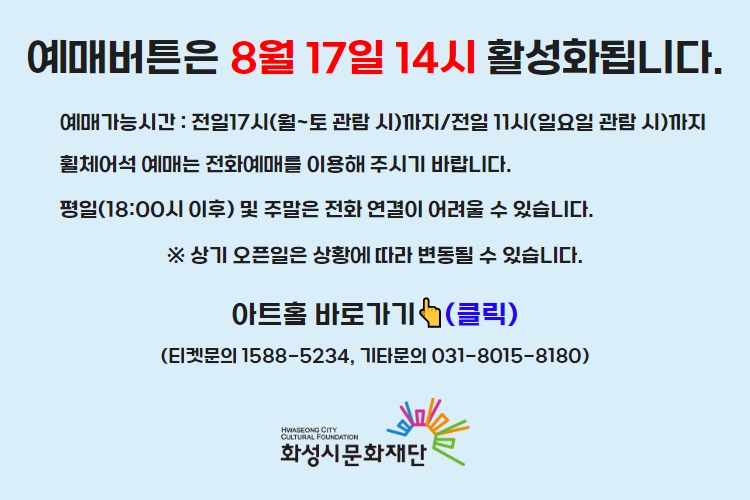 티켓 예매 안내 예매버튼은 8월 17일 14시에 활성화 됩니다. 예매가능시간: 전일 17시(월~토 관람 시)까지 /전일 11시(일요일 관람 시)까지 휠체어석 예매는 전화예매를 이용해주시기 바랍니다. 평일 18시 이후 및 주말은 전화 연결이 어려울 수 있습니다. 통합예약시스템을 통해 예매한 경우, 예매 확인 미취소는 유선상으로만 이용 가능합니다. 티켓문의 1588-5234 상기오픈일은 상황에 따라 변동될 수 있습니다.
