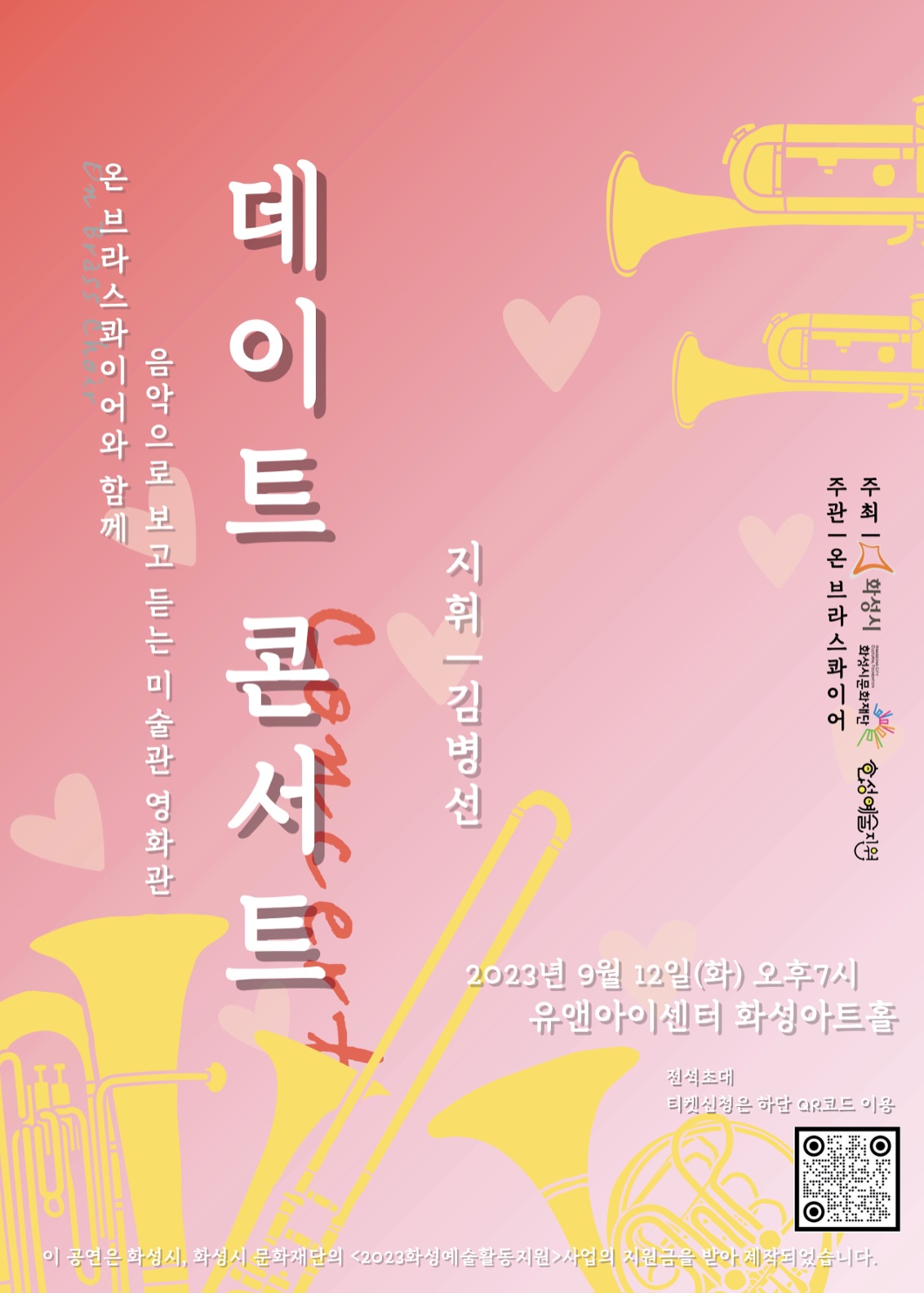 【[공 연]대관공연】온브라스 콰이어 데이트 콘서트 장소 화성아트홀 기간 2023년 9월 12일 ~ 2023년 9월 12일 요일 수 공연시간 19:00 티켓정보 관람등급 5세 이상 문의 01029938261 .사업의 지원금을 받아 제작되었습니다. On 온 브라스콰이어와 함께 음악으로 보고 듣는 미술관 영화관 데이트 콘서트 Concert 2023년 9월 12일(화) 오후7시 지휘 | 김병선 유앤아이센터 화성아트홀 전석초대 주최 | 화성시문화재단 인성이술지원 주관 |온 브라스콰이어 티켓신청은 우측 하단 QR코드 이용기" target="_blank"> KakaoTalk_20230831_230039335_06.png [ Size : 1.52MB, Down : 875 ] 미리보기 다운로드 KakaoTalk_20230831_230039335_06 KakaoTalk_20230831_230039335_05.jpg [ Size : 258.23KB, Down : 1,044 ] 미리보기 다운로드 KakaoTalk_20230831_230039335_05 목록보기