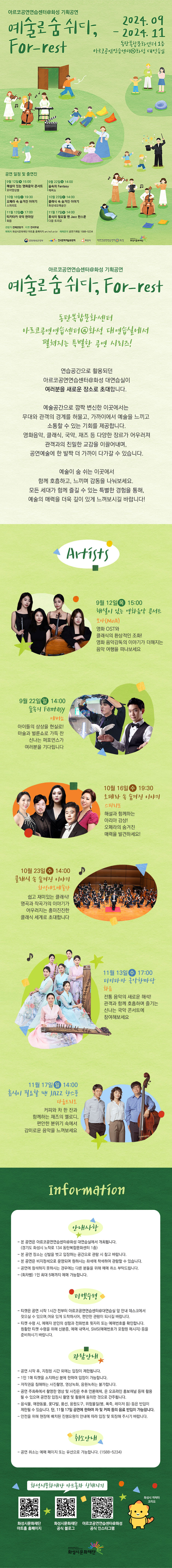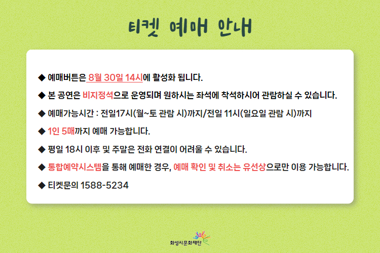 【[공 연]기획공연】[마술쇼] 숲속의 Fantasy 에버쇼 장소 기타 기간 2024년 9월 22일 ~ 2024년 9월 22일 요일 일 공연시간 14시 (60분 이내) 티켓정보 전석무료 관람등급 전체관람가 문의 1588-5234 ※ 본 공연은 연습공간 '아르코공연연습센터@화성 대연습실'에서 진행되는 공연입니다. 최종 2) 아트홀목록이미지(180-120).jpg [ Size : 53.86KB, Down : 408 ] 미리보기 다운로드 최종 2) 아트홀목록이미지(180-120) 인터파크이미지.jpg [ Size : 34.86KB, Down : 406 ] 미리보기 다운로드 인터파크이미지 0305 티켓오픈 (3).jpg [ Size : 422.29KB, Down : 3,492 ] 미리보기 다운로드 0305 티켓오픈 (3) 최최최종.jpg [ Size : 1.03MB, Down : 3,405 ] 미리보기 다운로드 최최최종 목록보기