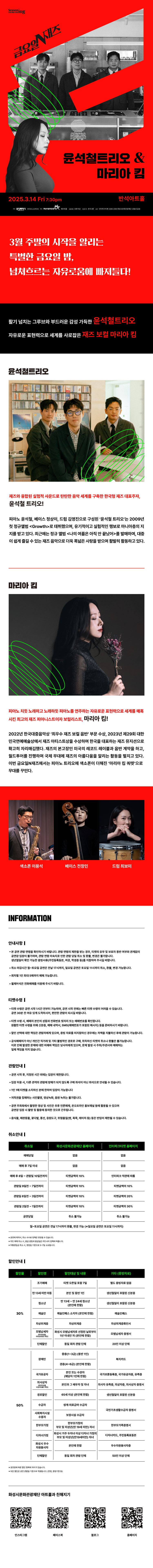 【[공 연]기획공연】금요일N재즈 <윤석철트리오 & 마리아킴> 장소 반석아트홀 기간 2025년 3월 14일 ~ 2025년 3월 14일 요일 금 공연시간 19:30(90분) 티켓정보 전석 4만원 관람등급 8세 이상 관람가 문의 1588-5234 ※예매 바로가기 버튼은 2월 4일(화) 11시에 활성화됩니다. (03.14)윤석철트리오_아트홀목록이미지.png [ Size : 48.42KB, Down : 305 ] 미리보기 다운로드 (03.14)윤석철트리오_아트홀목록이미지 (25.03.14) 금요일N재즈_윤석철트리오&마리아 킴.jpg [ Size : 951.58KB, Down : 325 ] 미리보기 다운로드 (25.03.14) 금요일N재즈_윤석철트리오&마리아 킴 상세페이지_금요일N재즈.jpg [ Size : 902.9KB, Down : 1,539 ] 미리보기 다운로드 상세페이지_금요일N재즈 목록보기