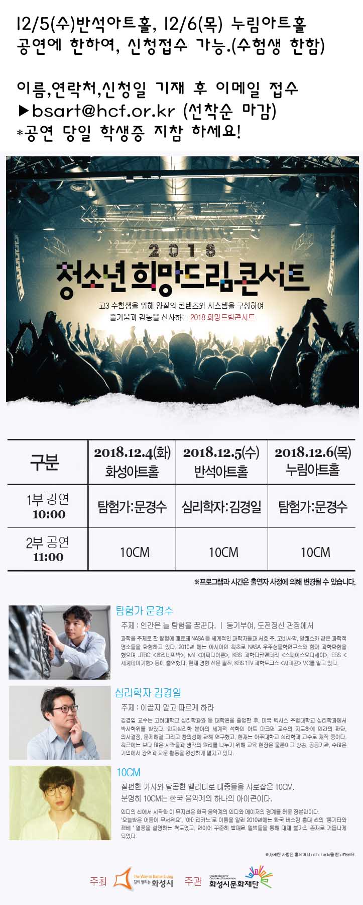 【[공 연]기획공연】2018수험생 희망비전 <청소년 희망드림 콘서트> 장소 반석아트홀 기간 2018년 12월 4일 ~ 2018년 12월 6일 공연시간 10시 티켓정보 무료신청 (bsart@hcf.or.kr) 관람등급 화성시 관내 수험생 문의 1588-5234, 1899-3254 . 썸네일180_120.jpg [ Size : 612.63KB, Down : 406 ] 미리보기 다운로드 상단포스터_270_365.jpg [ Size : 124.72KB, Down : 409 ] 미리보기 다운로드 Untitled-1.jpg [ Size : 182.96KB, Down : 983 ] 미리보기 다운로드 목록보기
